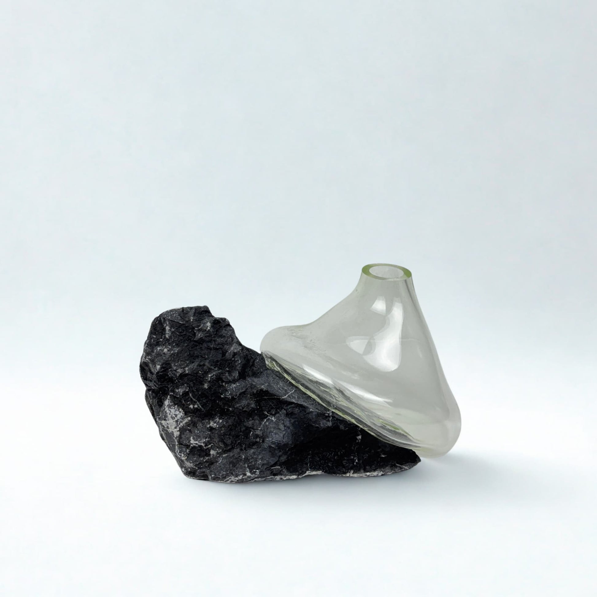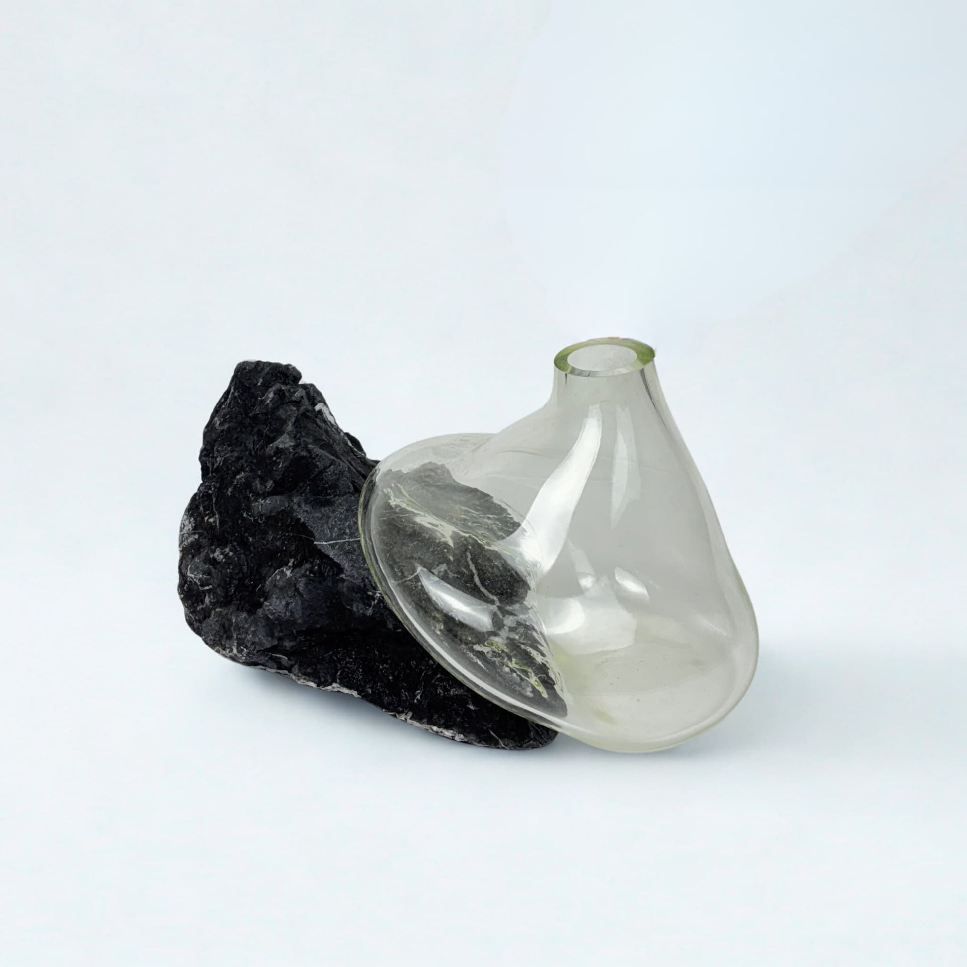 Dekorasyonda sadeliğin en saf halini arayanlar için tasarlanan Atlas Şeffaf Cam Vazo No:2, kontrastın gücünü yaşam alanlarınıza taşıyor. Koyu tonlu, karakteristik bir kaya parçasının üzerine, henüz kor halindeyken bırakılan şeffaf cam; taşın tüm kıvrımlarını kucaklayarak donuyor.