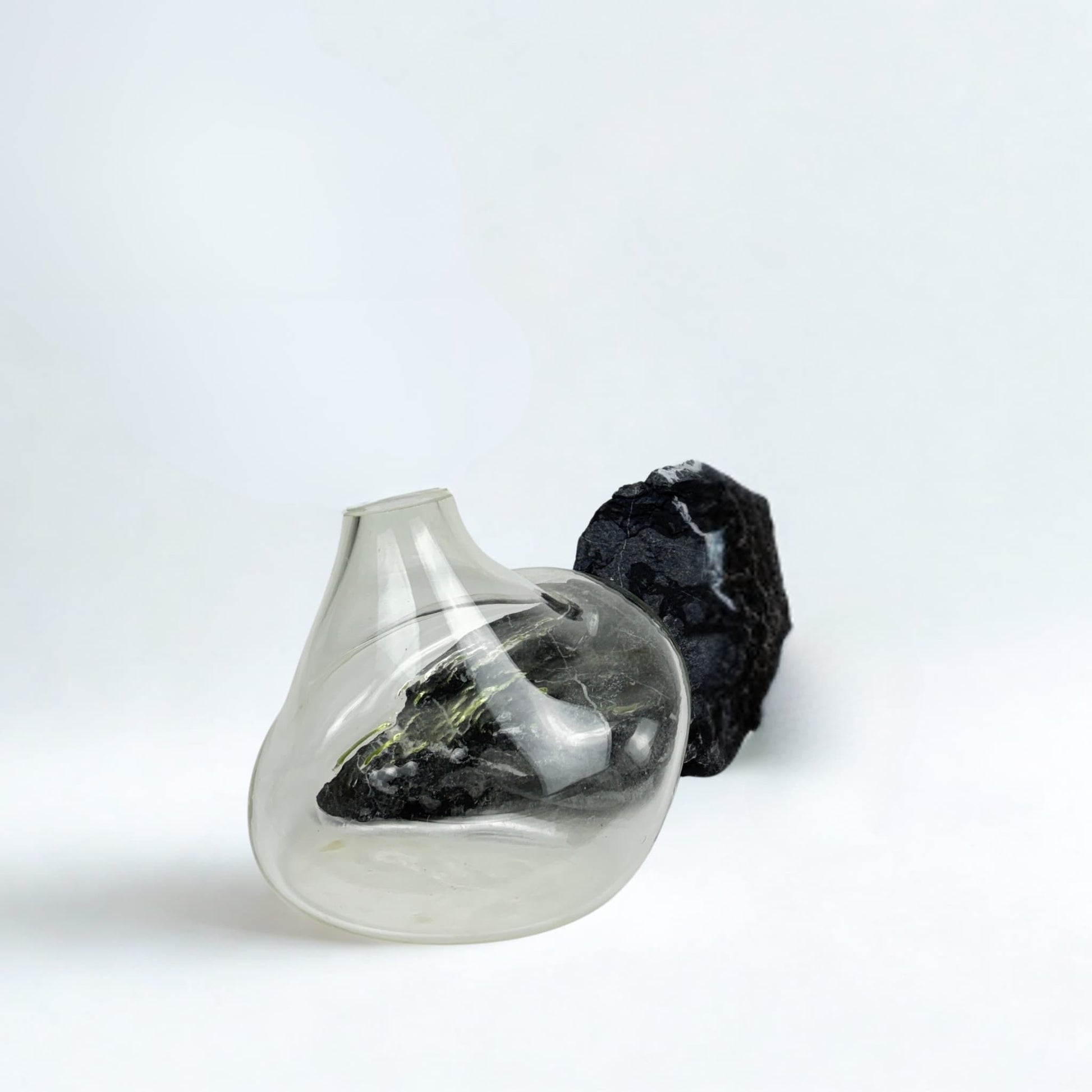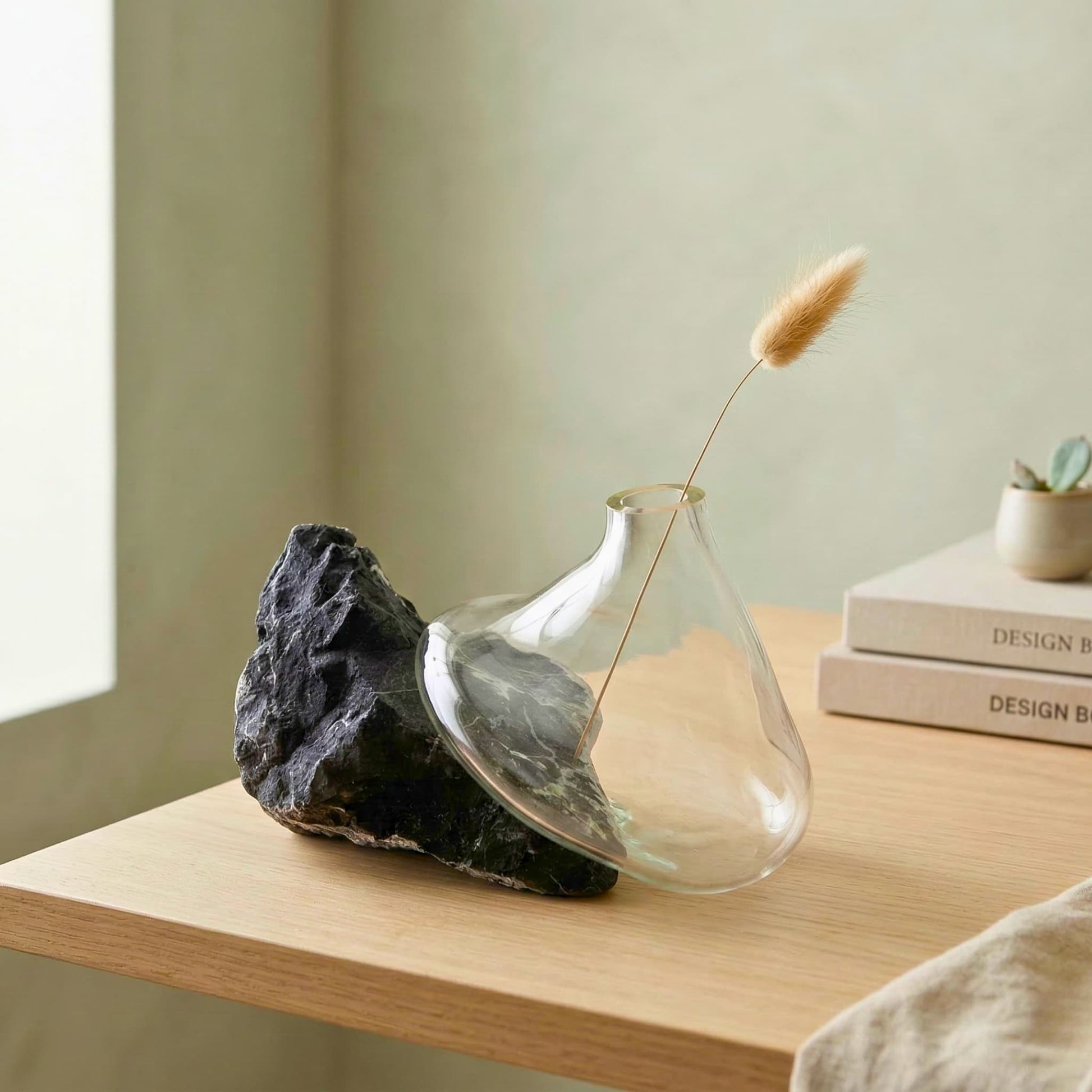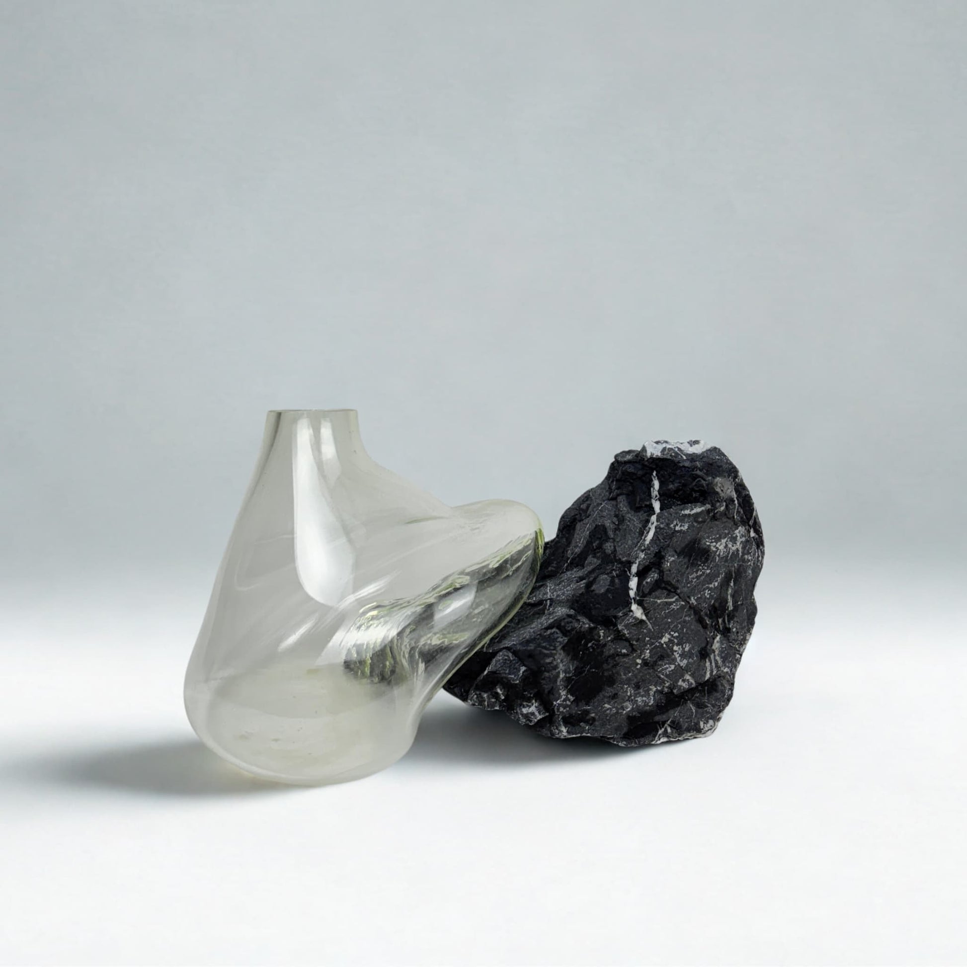 No:1 modelinin beyaz zarafetine karşın, No:2 modeli tam şeffaflığıyla öne çıkar. Bu şeffaflık, vazonun içindeki taşın dokusunu ve ışığın kırılmalarını her açıdan görünür kılarak büyüleyici bir derinlik algısı yaratır. Ham doğa ile rafine zanaatkarlığın bu dansı, evinizde veya ofisinizde modern bir kürasyonun en değerli parçası olacak.