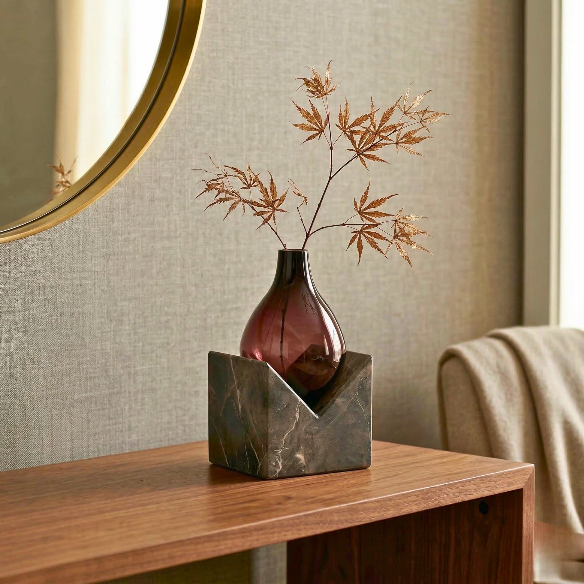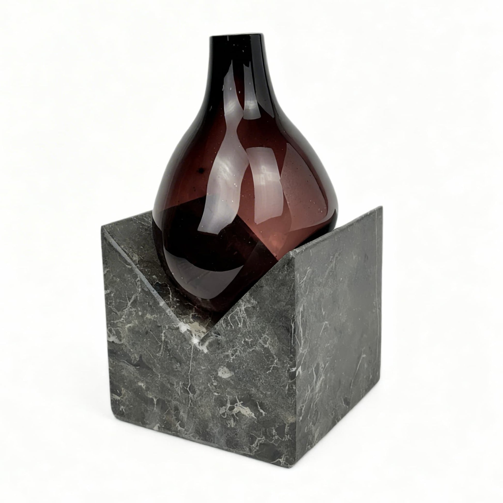Bosphorus Bordo Cam Vazo No:3, İstanbul’un birleştirici gücünden ilham alarak, iki zıt materyali tek bir formda buluşturur. Tasarımın kaidesini oluşturan masif antrasit mermer, keskin V-formuyla modern mimari bir duruş sergilerken; üzerine nefesle kondurulan bordo cam, bu yapıya organik ve akışkan bir ruh katar.