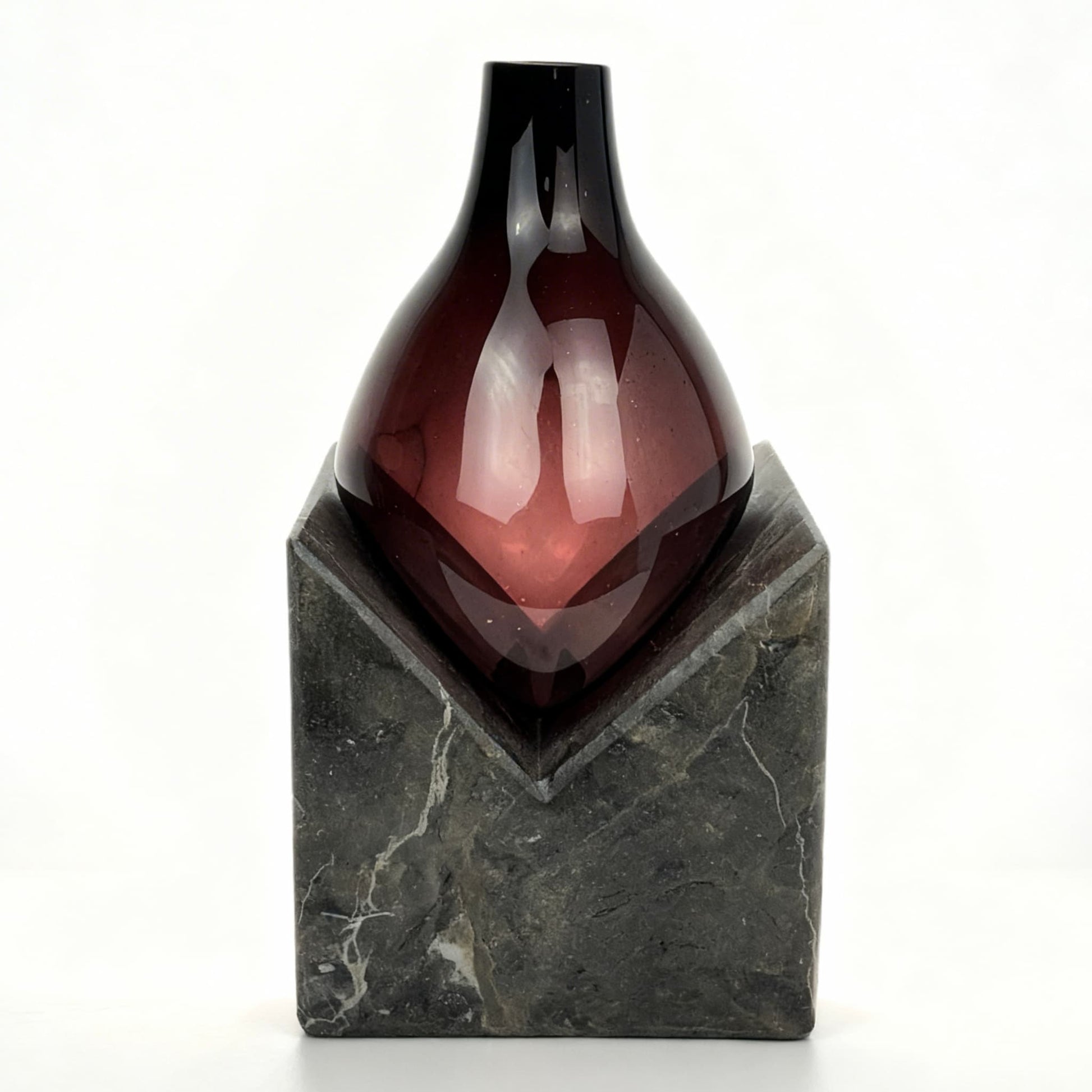 Bu vazonun en belirgin özelliği, mermer ve camın arasındaki temas noktasıdır. Sıcak camın mermer üzerine doğrudan üflenerek dondurulması, her ürünü dünyada sadece size özel bir sanat eserine dönüştürür. Bordo rengin derin tonlardan şeffafa doğru açılan geçişleri, mermerin soğuk ve ağır karakteriyle mükemmel bir kontrast oluşturur.