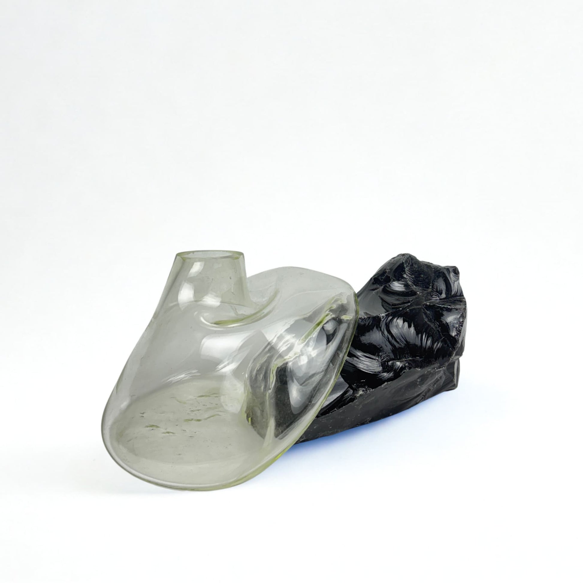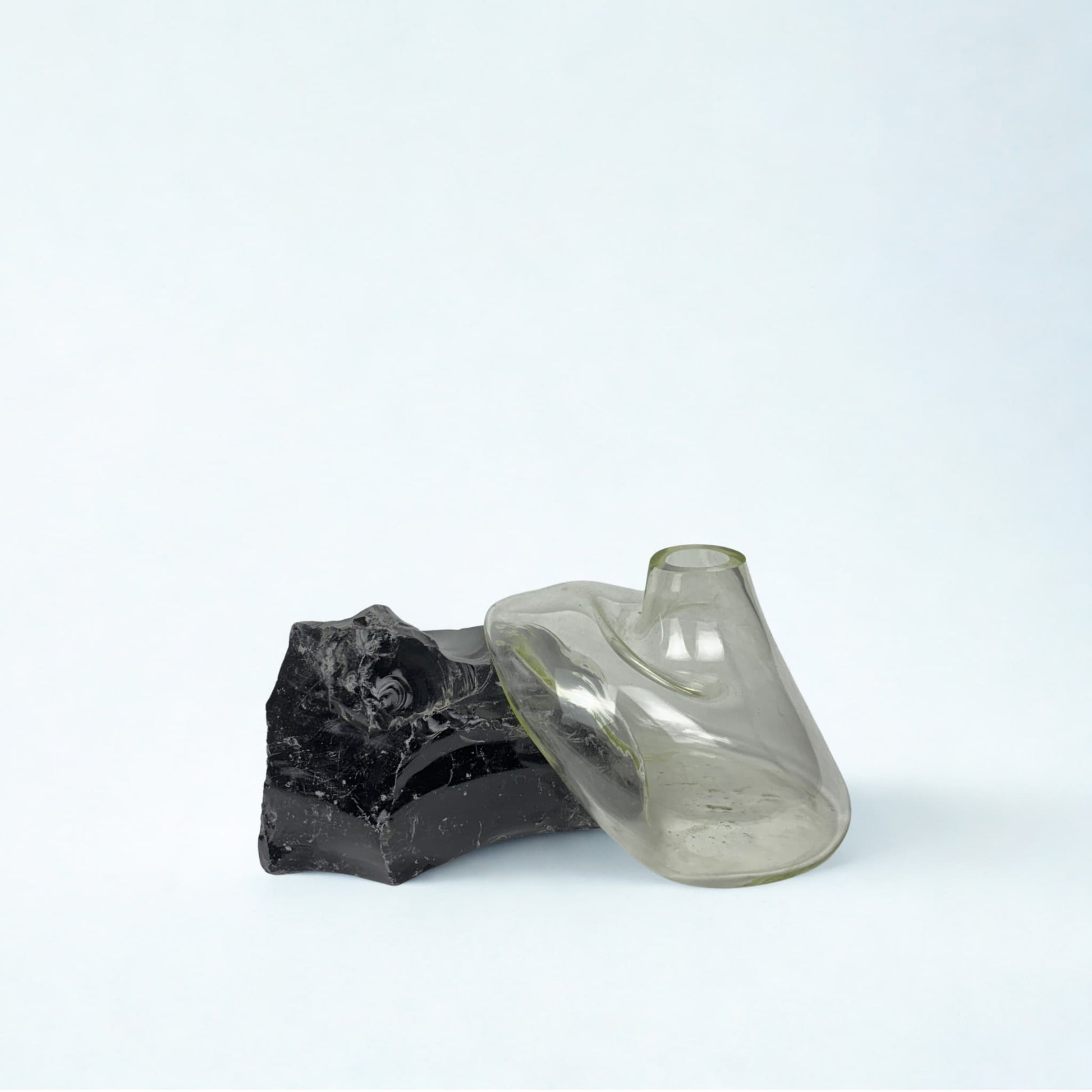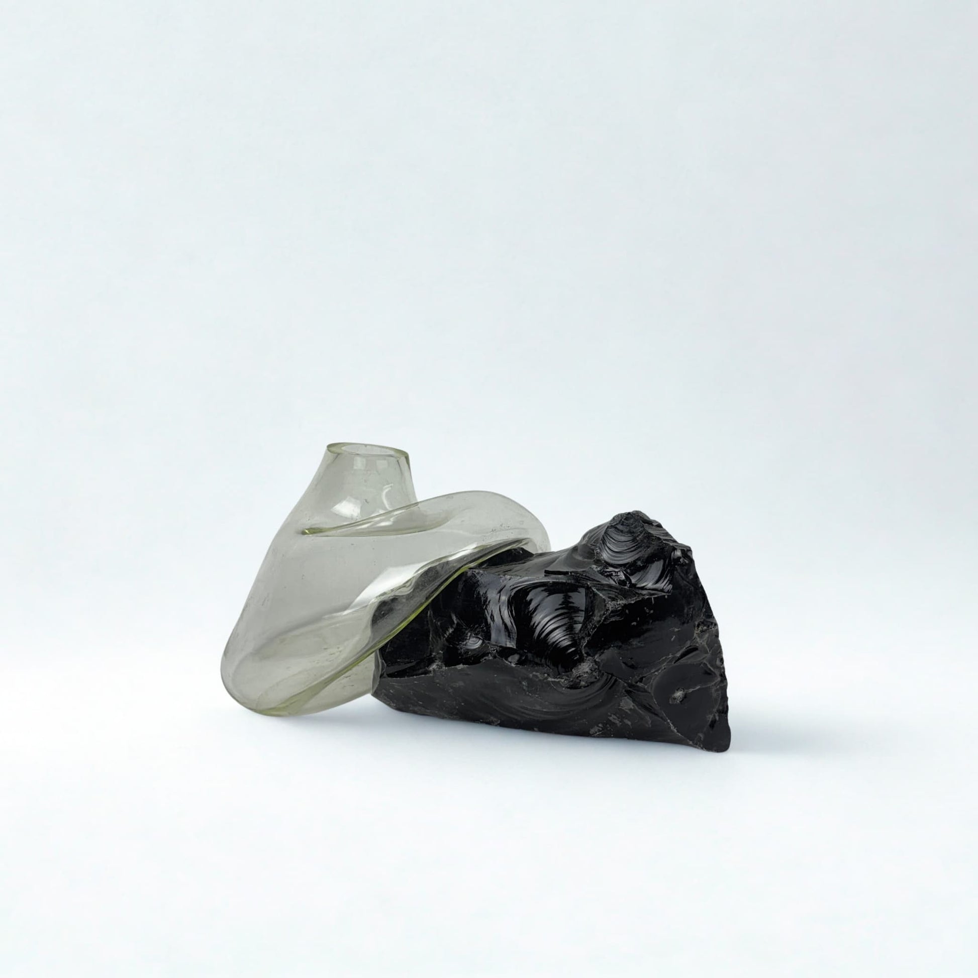 Obsidiyen Şeffaf Cam Vazo No:2, tasarımda "geçirgenlik" ve "kütle" arasındaki dengeyi teknik bir ustalıkla sorguluyor. Bu küratöryel obje, milyonlarca yıl önce volkanik bir aktivite sonucu oluşan "doğal cam" Obsidiyen ile zanaatkarın nefesiyle hayat bulan modern camı dikey bir formda buluşturur. Serinin ilk parçasına kıyasla No:2, camın taşın keskin hatlarına daha geniş bir açıyla tutunmasıyla karakterize edilir; bu da her iki malzemenin ışık altındaki yansıma kapasitesini en üst seviyeye çıkarır.