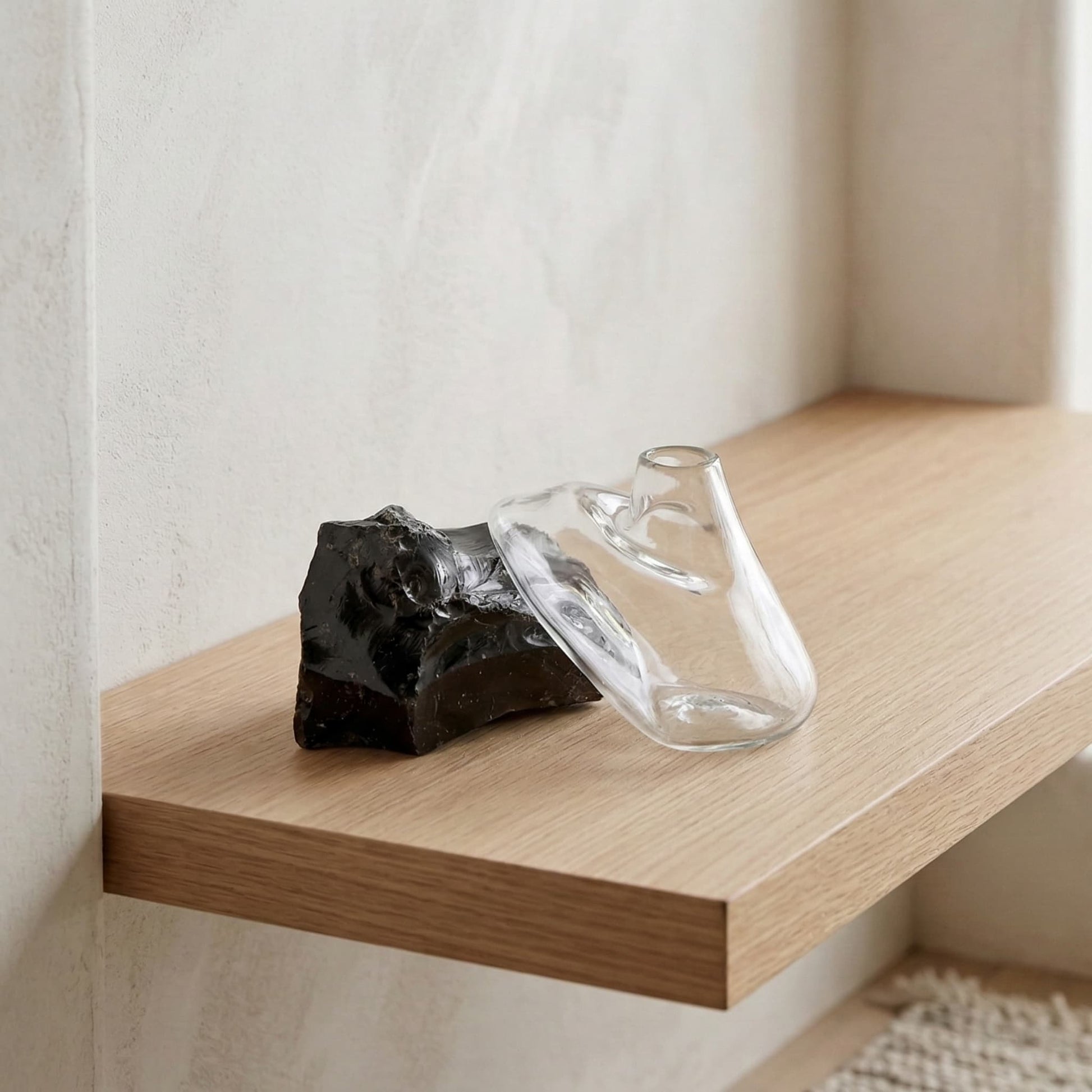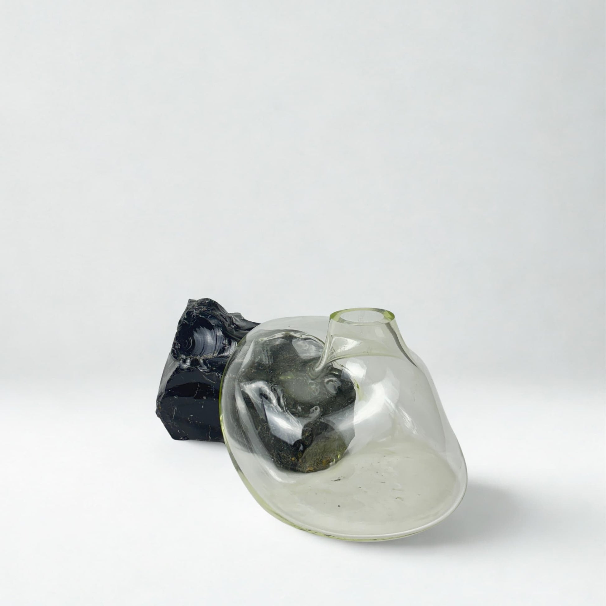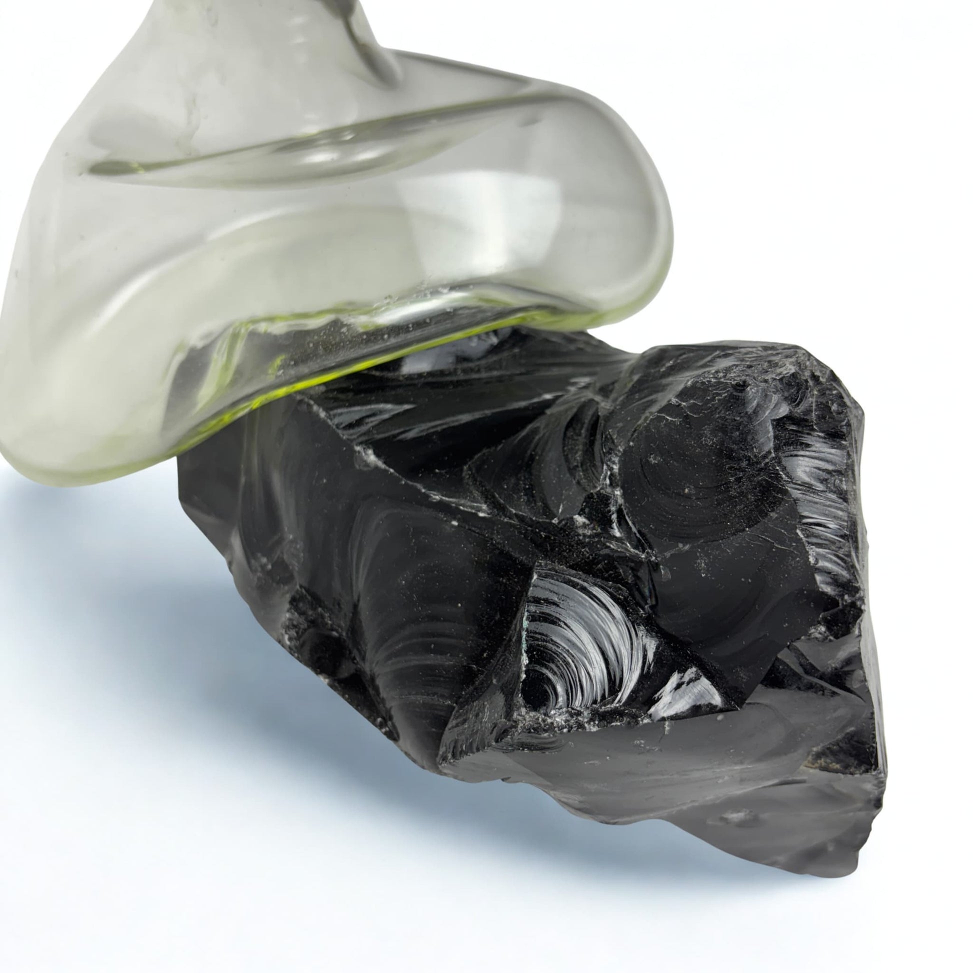 Obsidiyen kayanın siyah, metalik parlaklığı ve karakteristik pürüzlü dokusu, şeffaf gövdenin pürüzsüz yüzeyiyle doğrudan temas halindedir. Bu temas, sıcak camın taşın dondurucu soğukluğunda şekil aldığı o kritik üretim anının kalıcı bir kanıtıdır. Modern ve minimalist mekanlarda sadece bir dekoratif unsur değil, aynı zamanda jeolojik bir tanıklık sunan bir sanat nesnesidir.