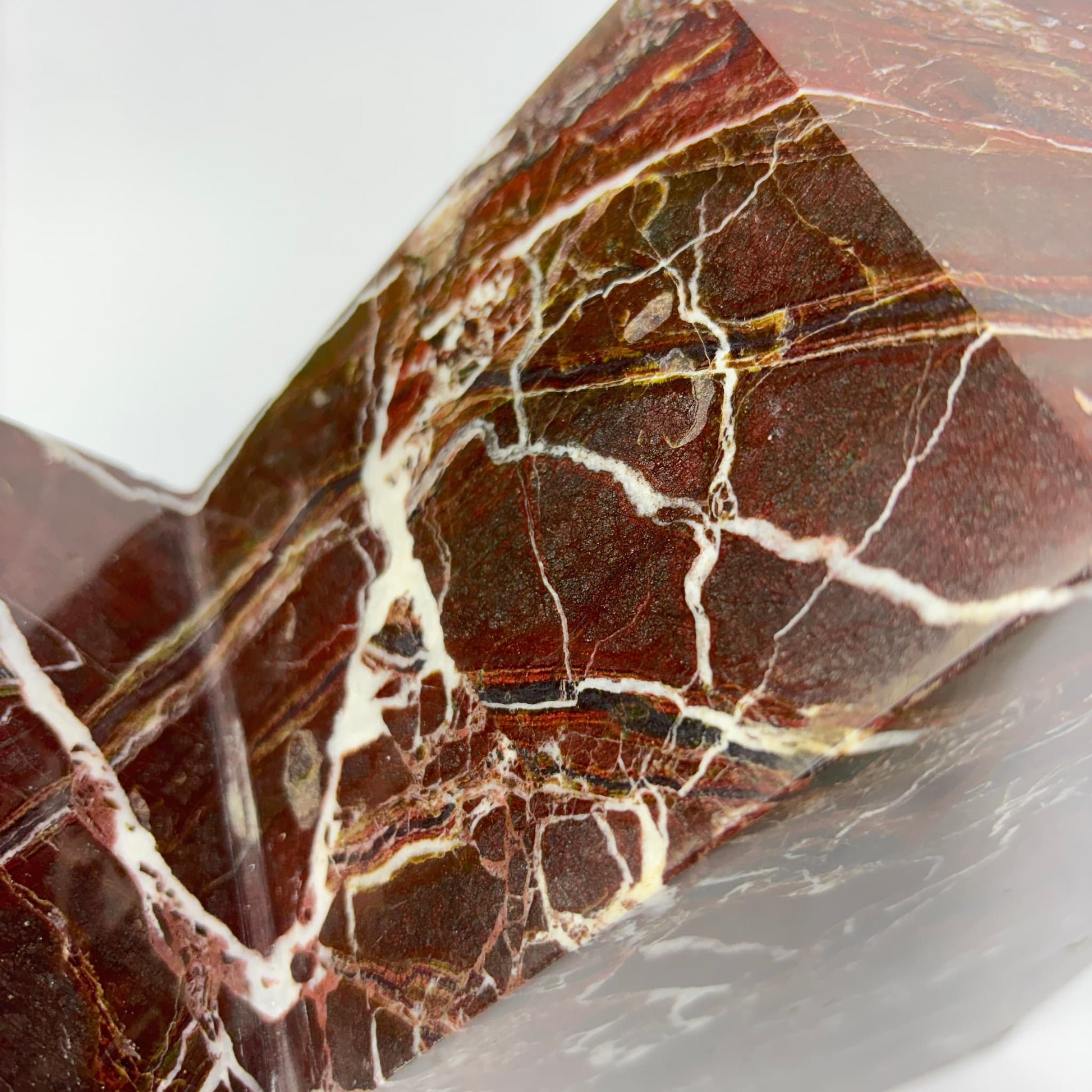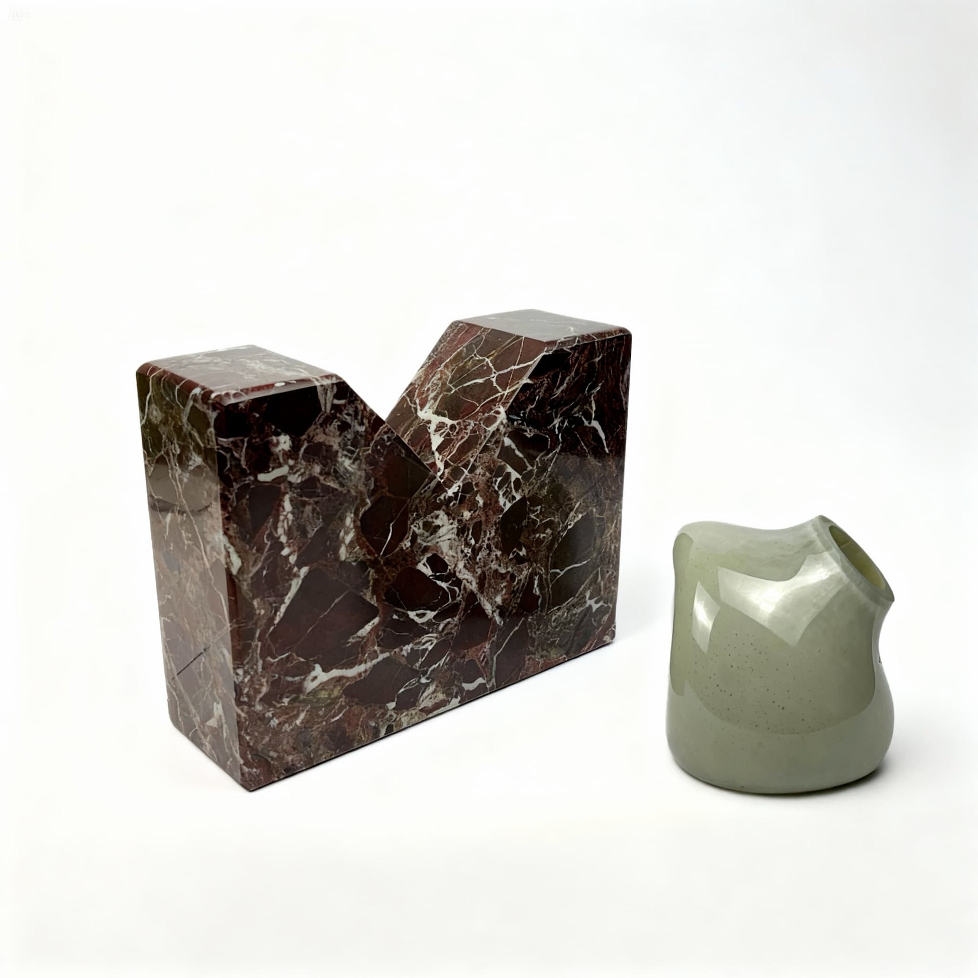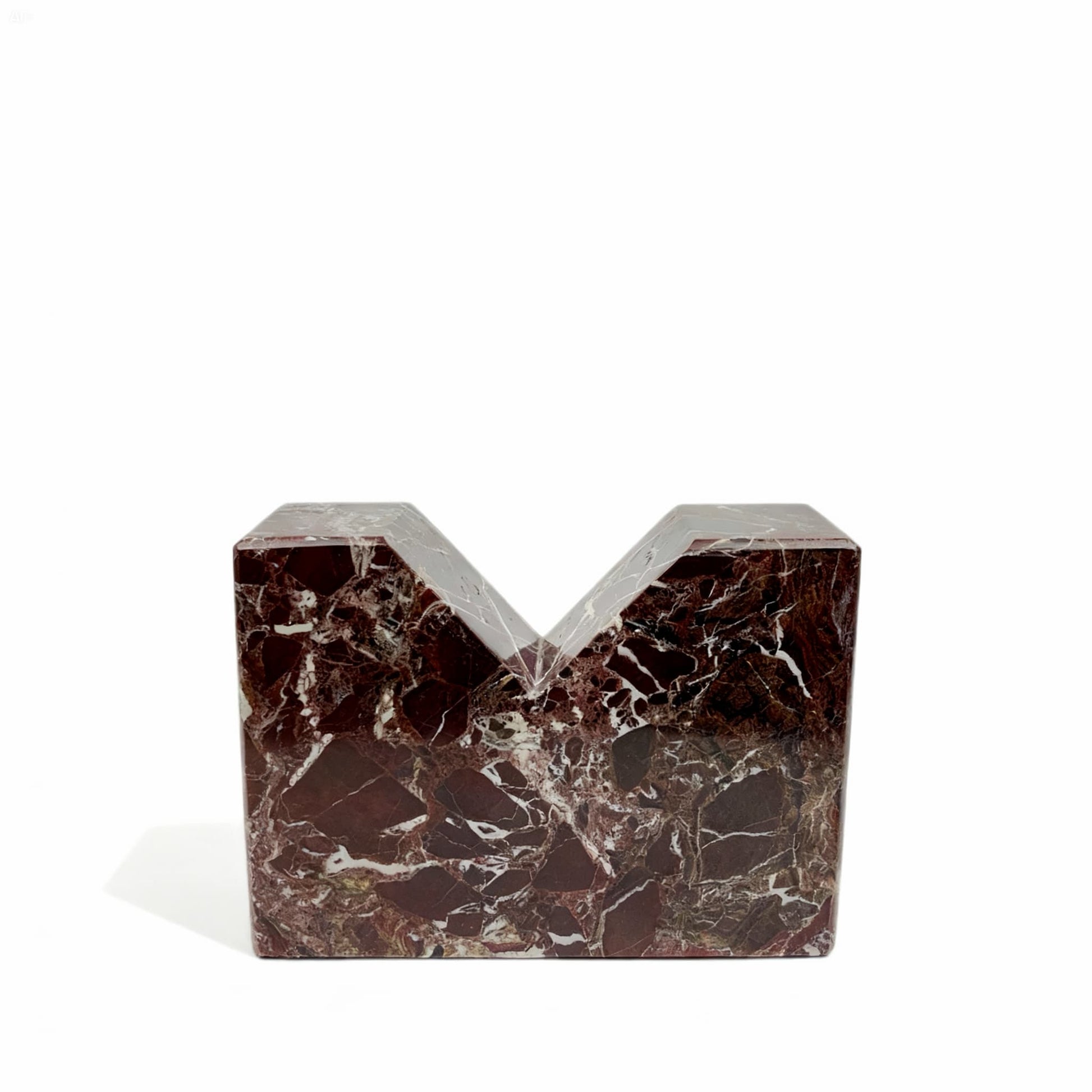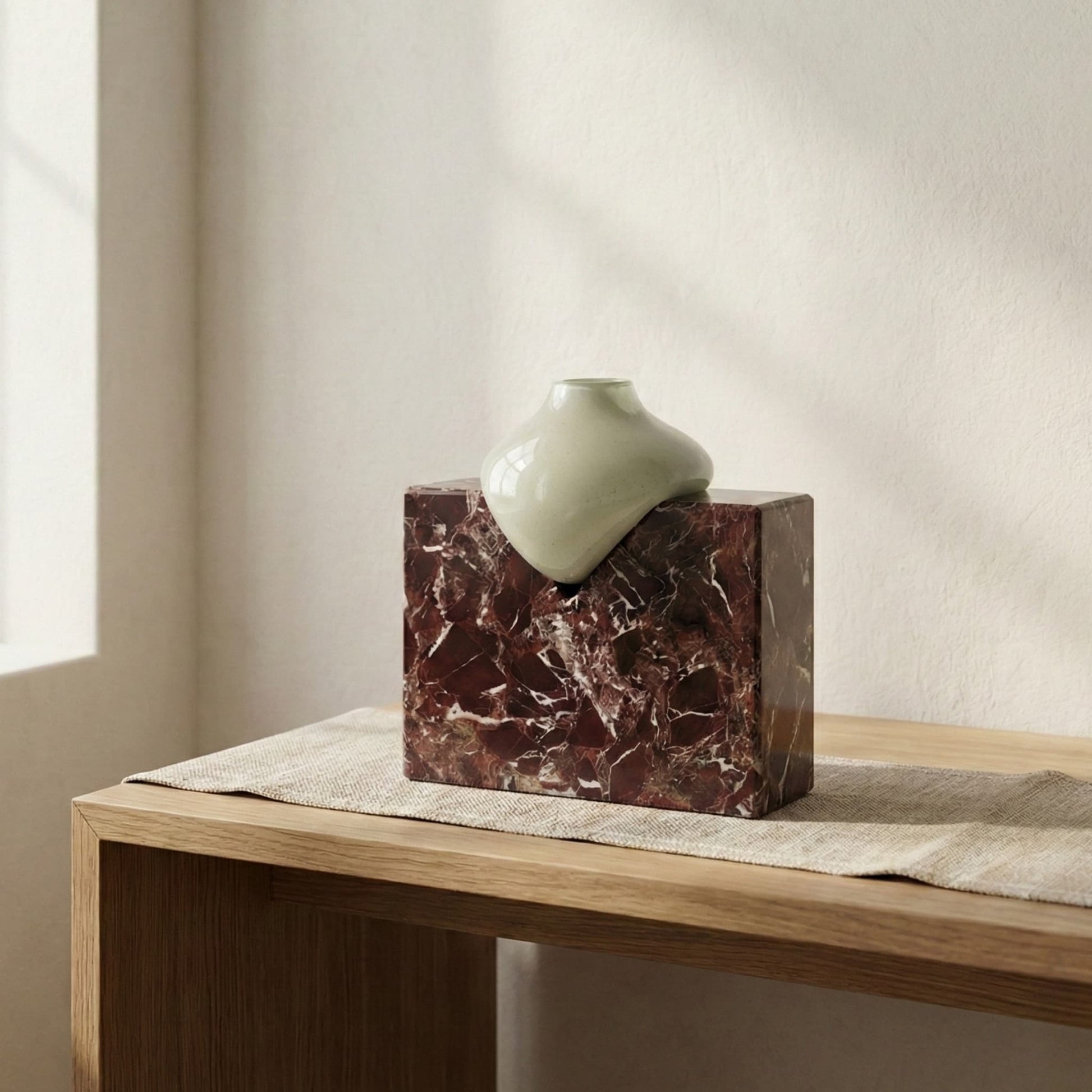 Elazığ Vişne mermerinden oluşan blok kaide, yoğun rengi ve belirgin damar yapısıyla mekânda güçlü bir ağırlık hissi yaratır. Keskin geometrisiyle sabit, net ve kararlı bir zemin sunar.