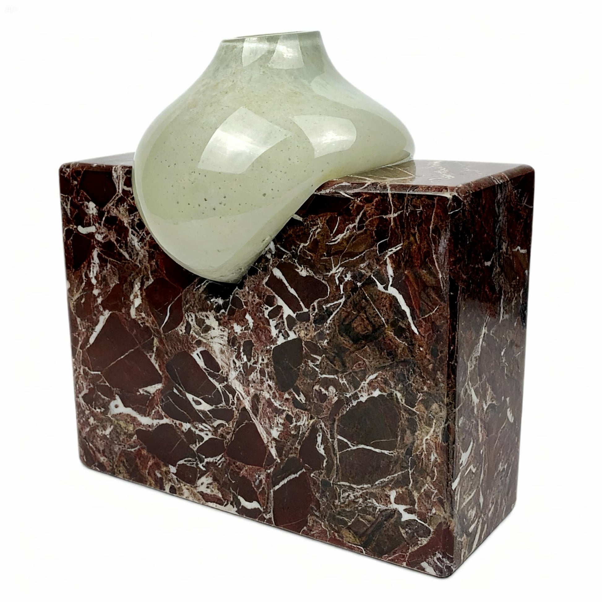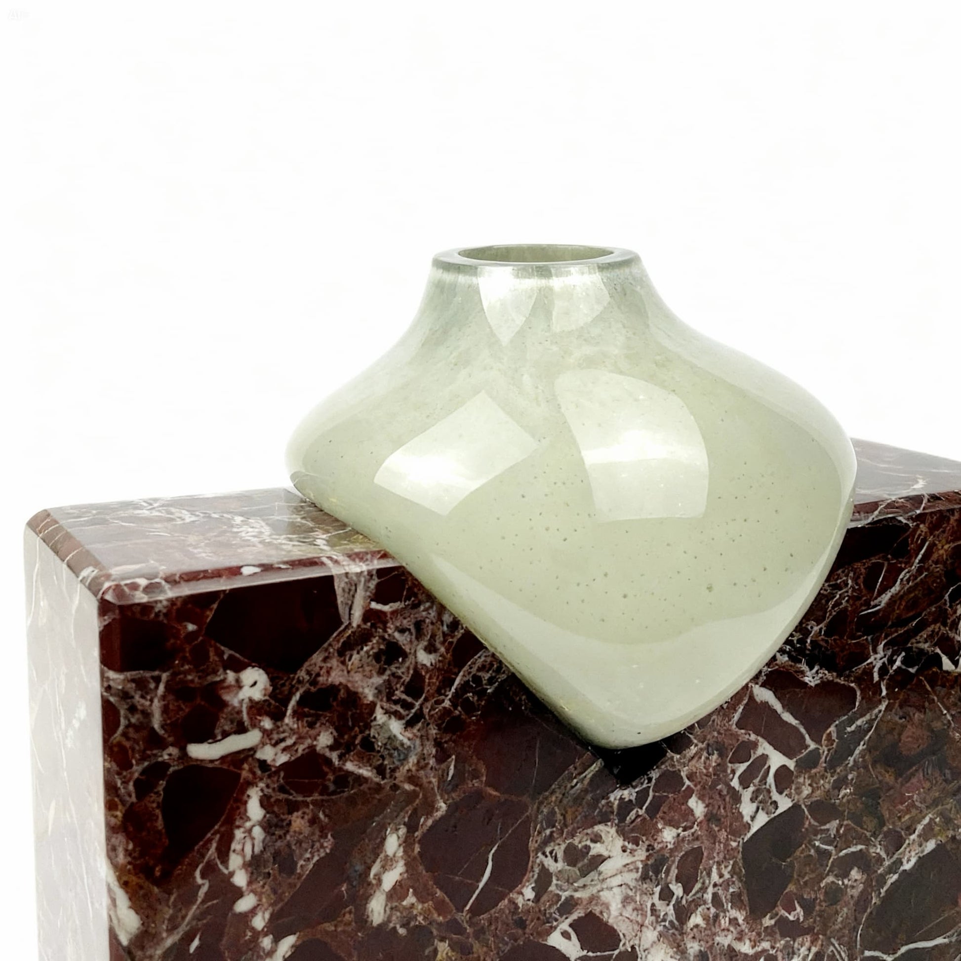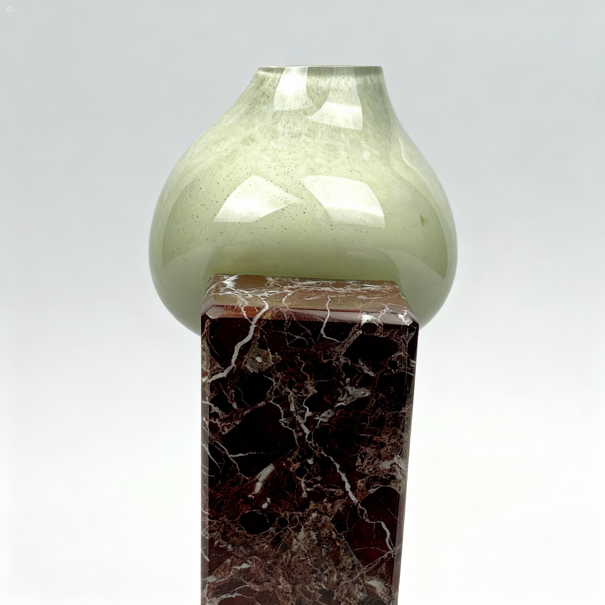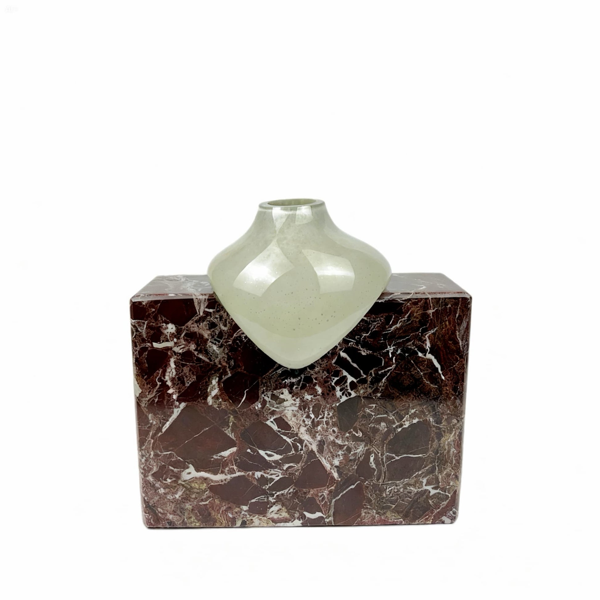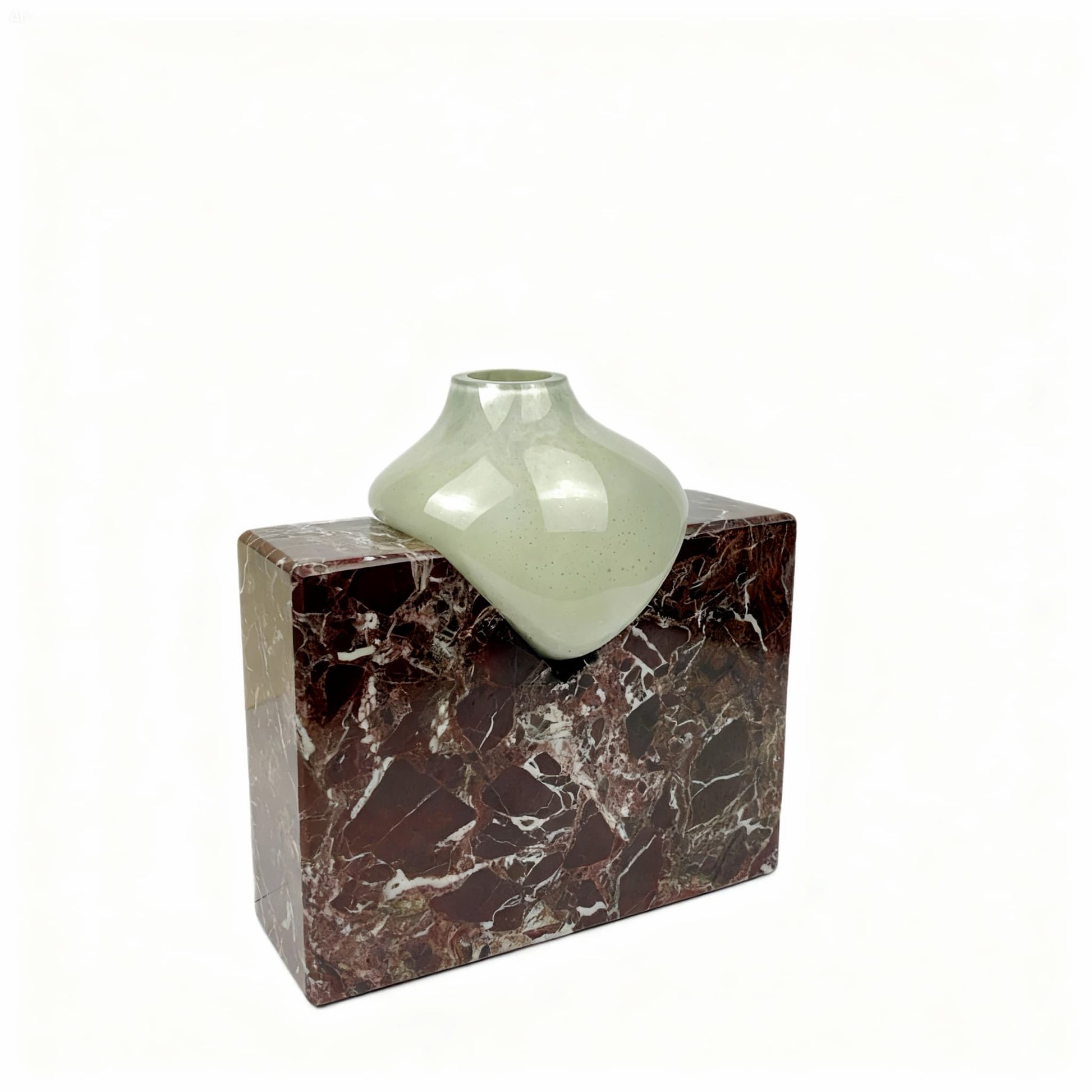 Bu kütlenin üzerinde yer alan beyaz cam form ise taşın sertliğine karşı yumuşak bir karşıtlık oluşturur. Cam, mermer bloğun kenarında konumlanır; tamamen merkezde durmaz, bilerek sınırda bırakılır. Bu yerleşim, tasarıma gerilim ve denge hissini aynı anda kazandırır.