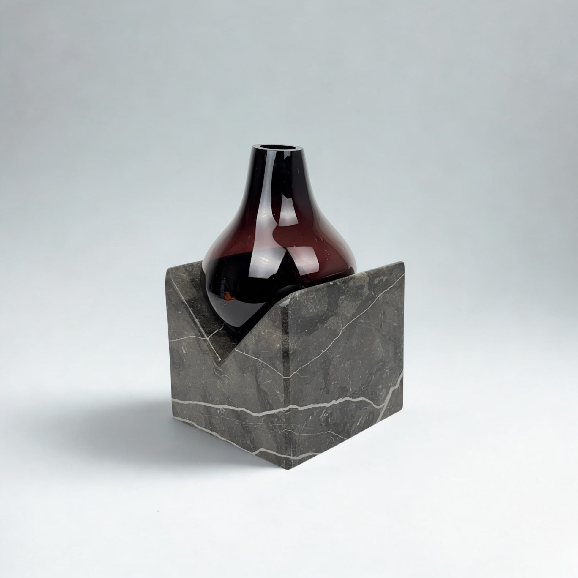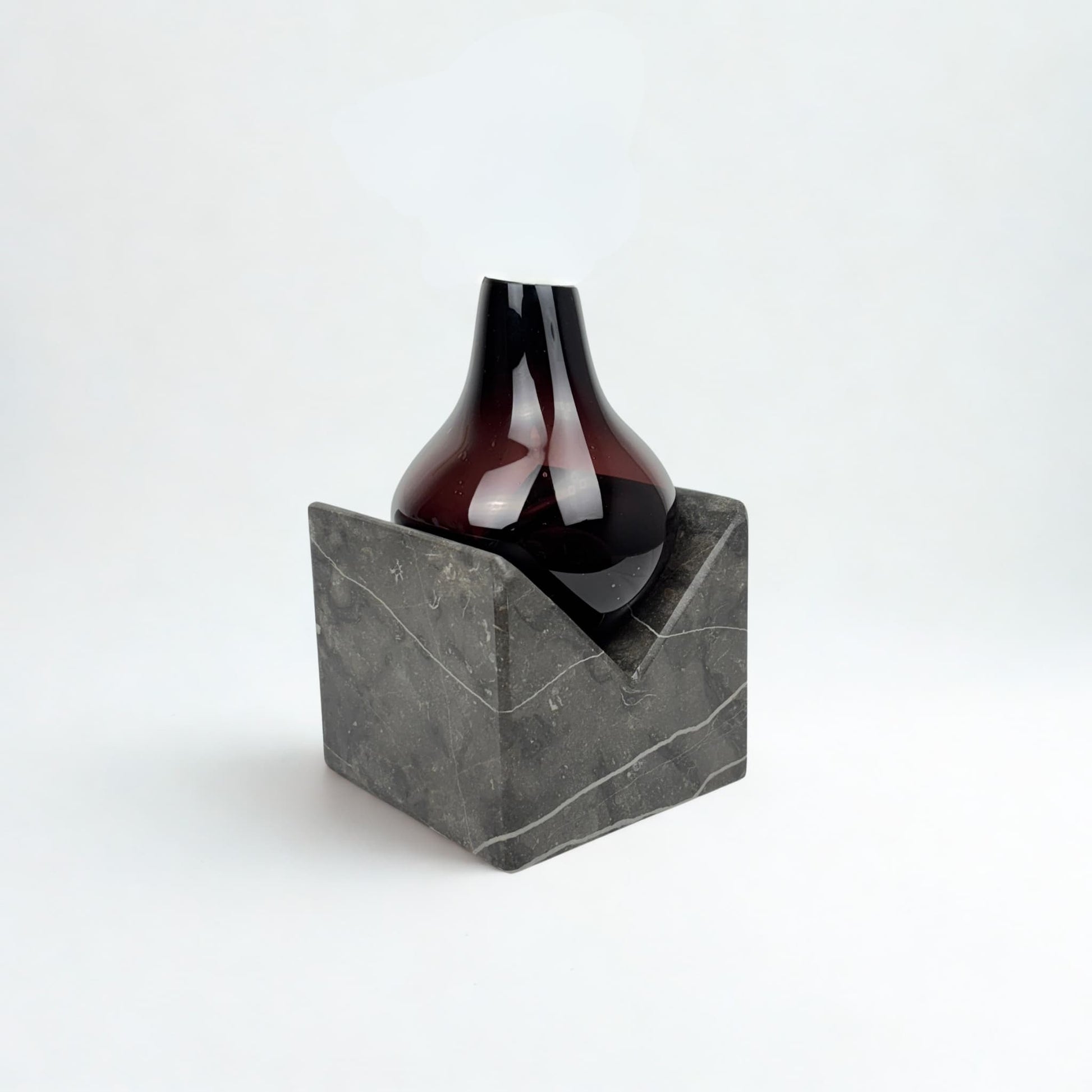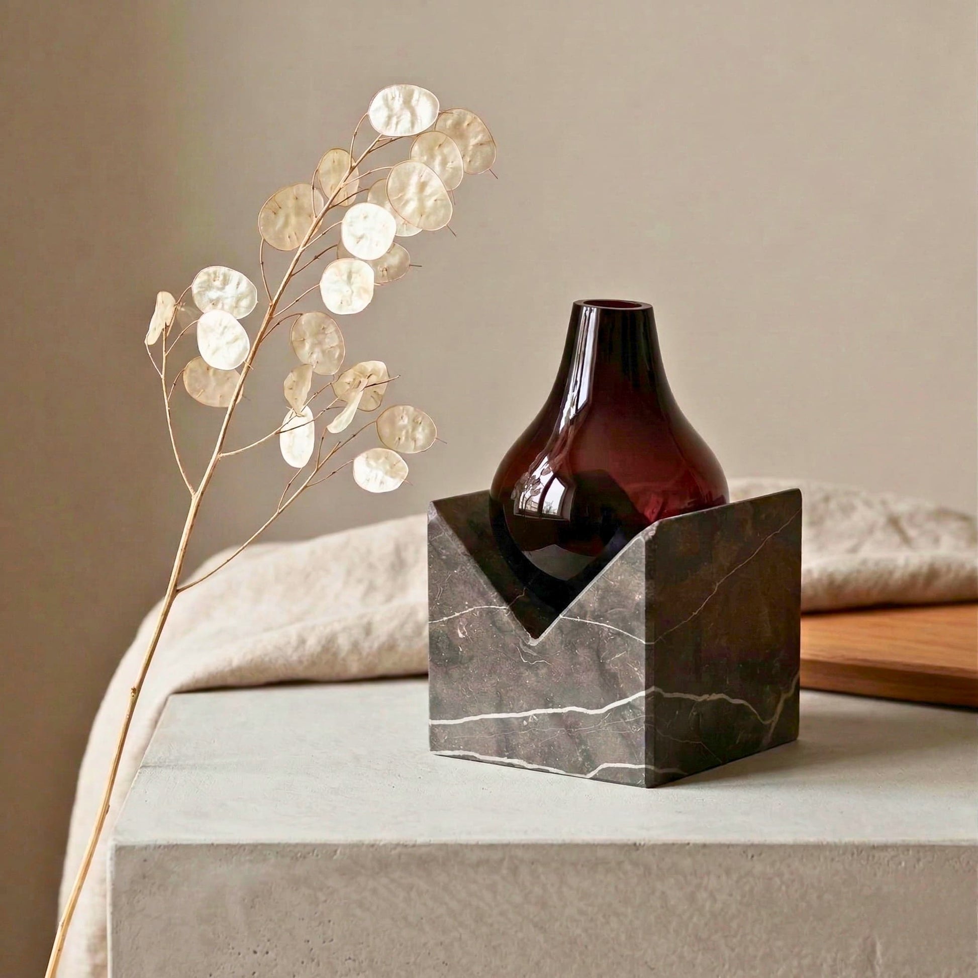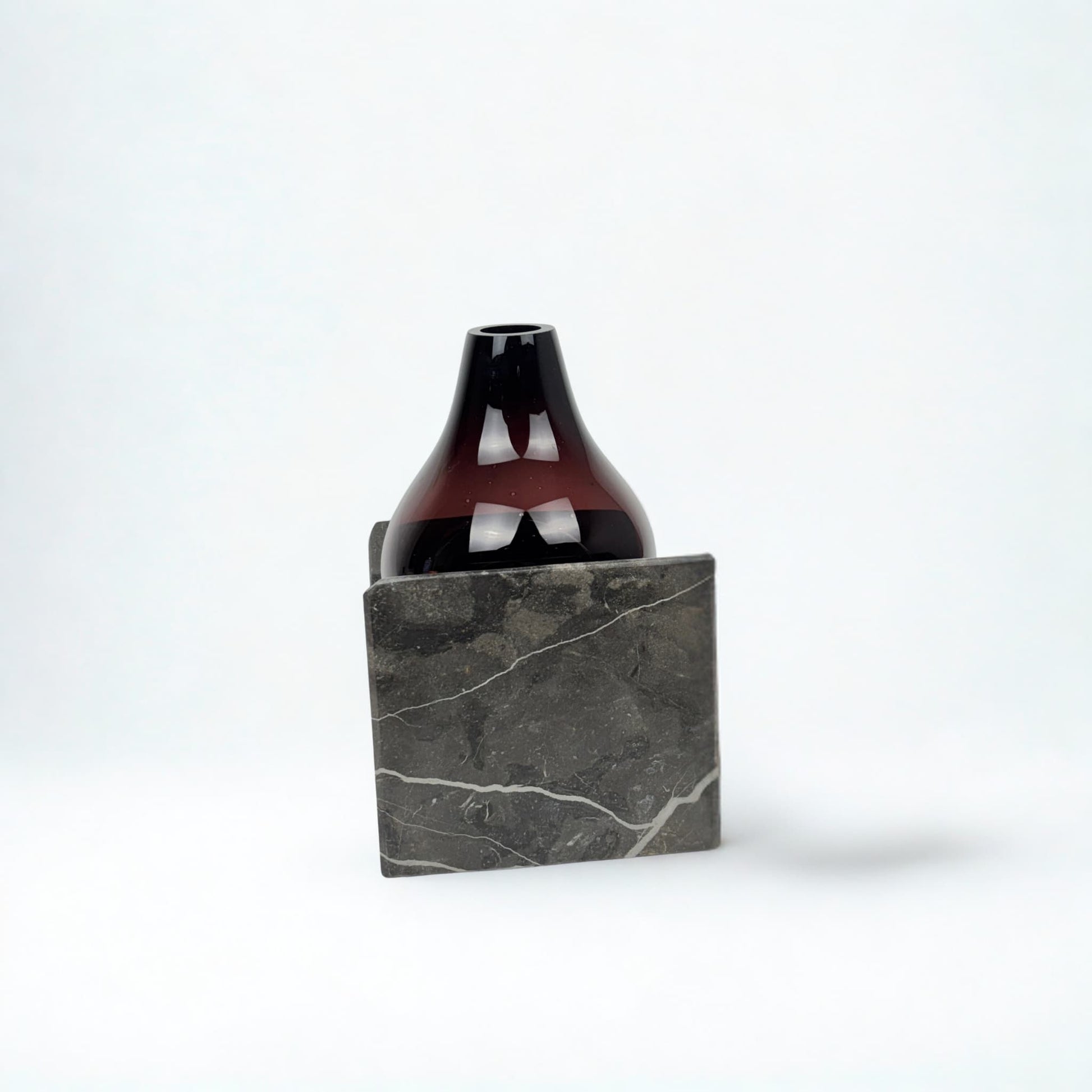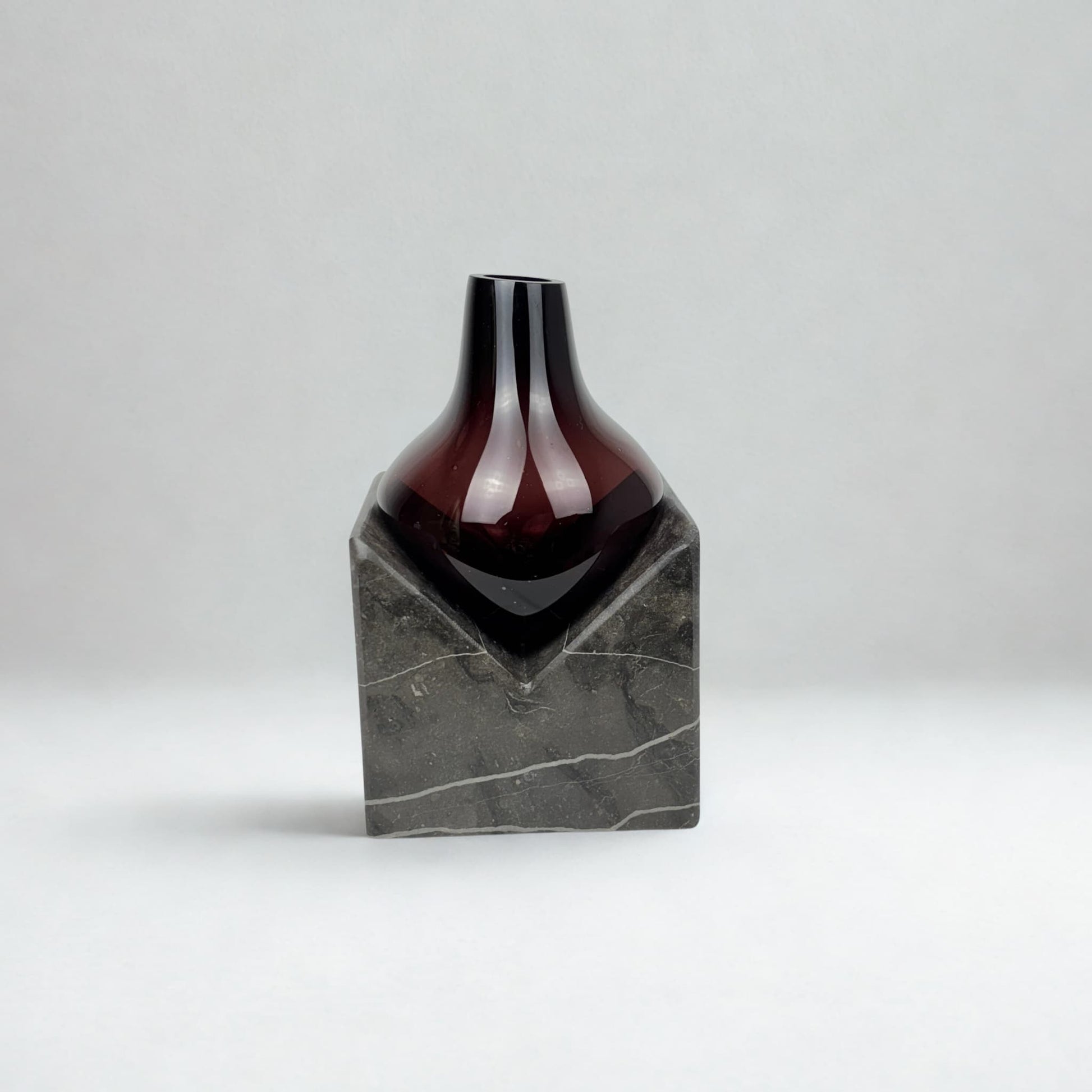 Vazonun tabanında yer alan, geometrik V formuna sahip Noir mermer, koyu tonları ve üzerindeki beyaz doğal damarlarıyla sarsılmaz bir gücü simgeler. Bu masif tabanın üzerine kondurulan el yapımı cam ise, bordo rengin en sıcak tonlarından şeffafa doğru süzülerek mermerin soğuk asaletine tutkulu bir cevap verir. Işığın vazo yüzeyindeki dansı, her saatte farklı bir görsel şölen sunar.