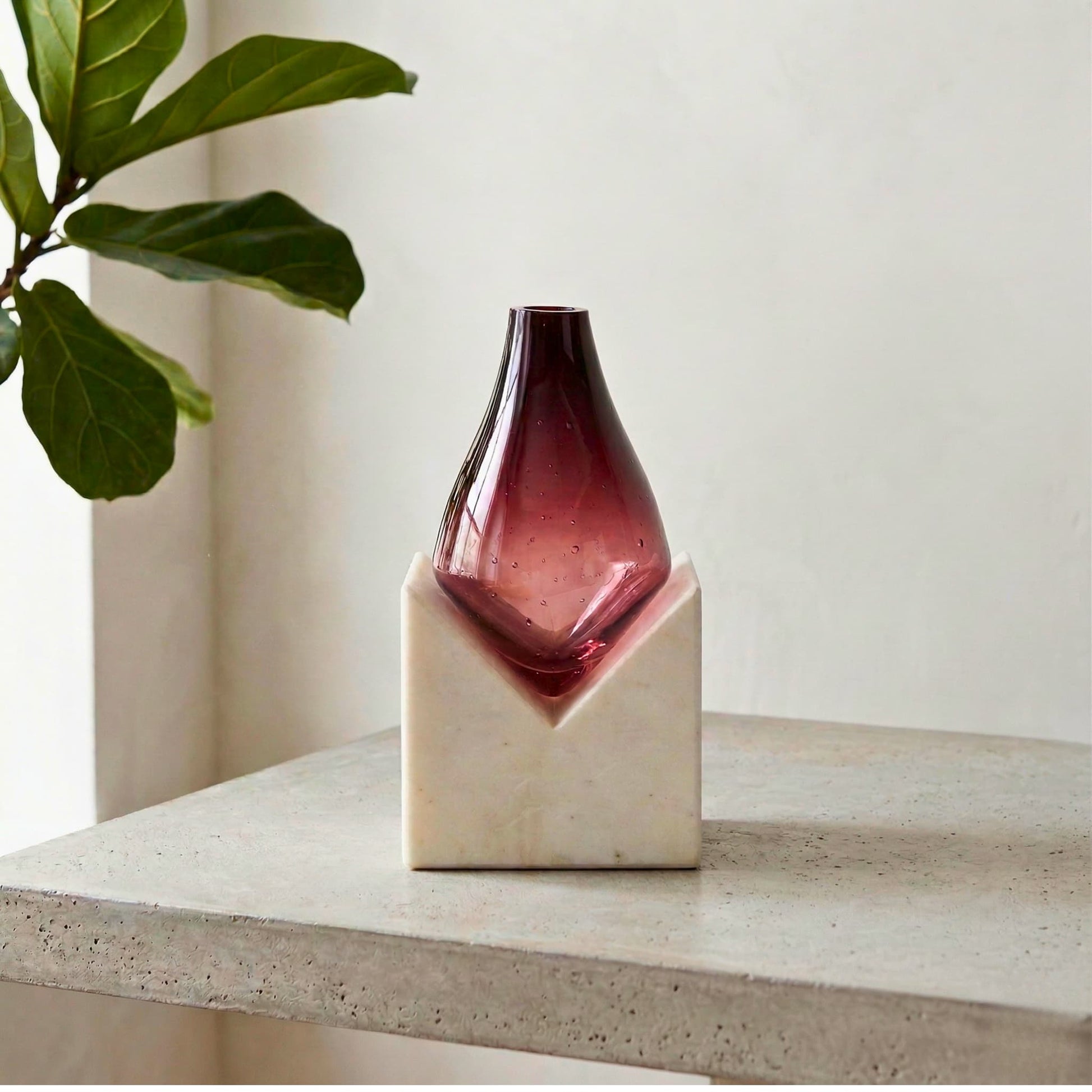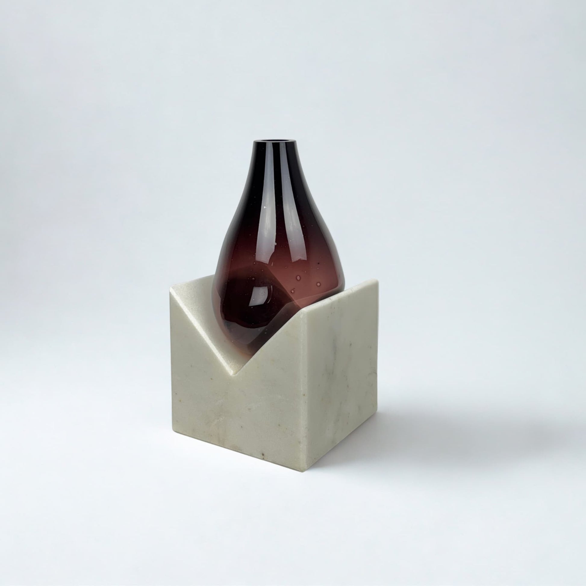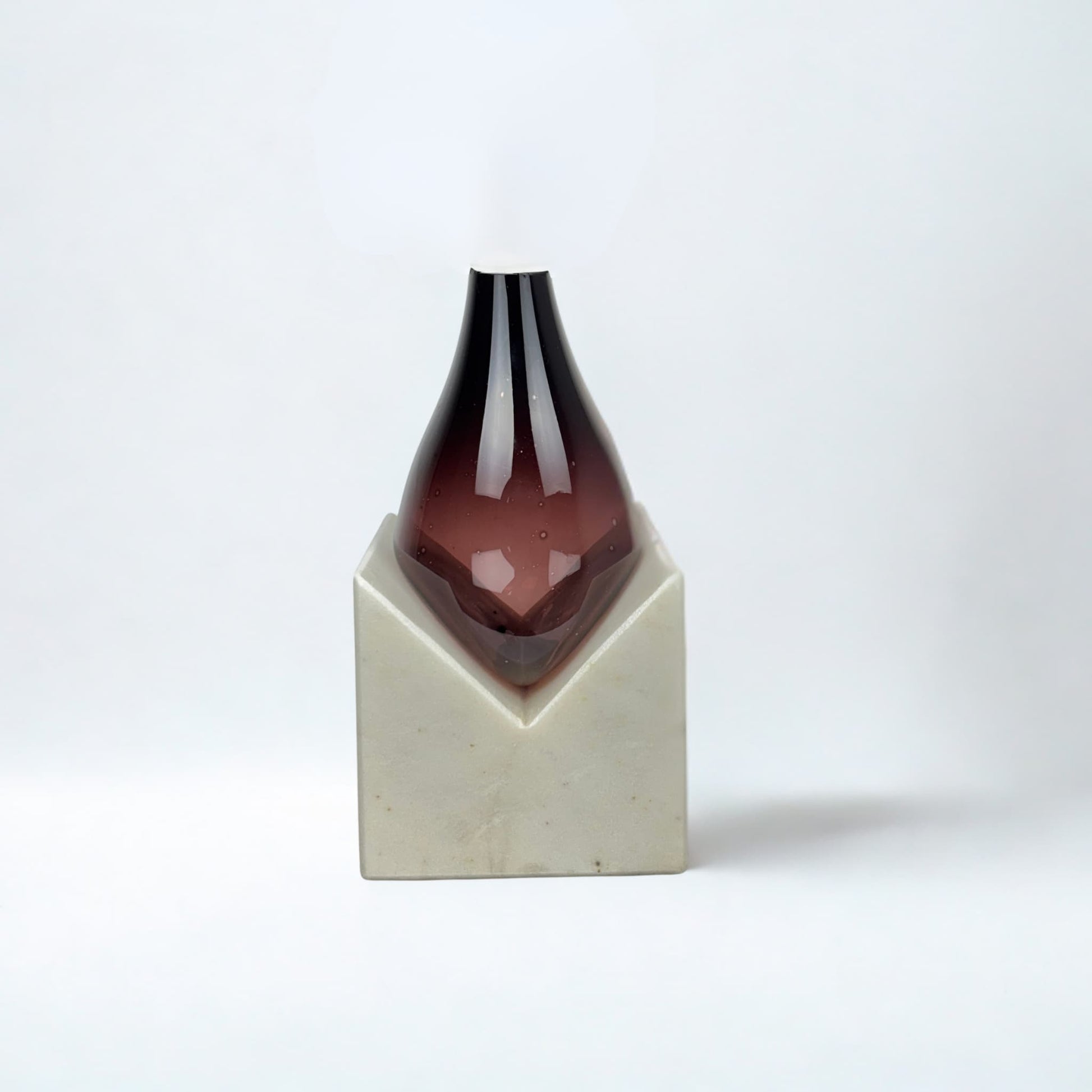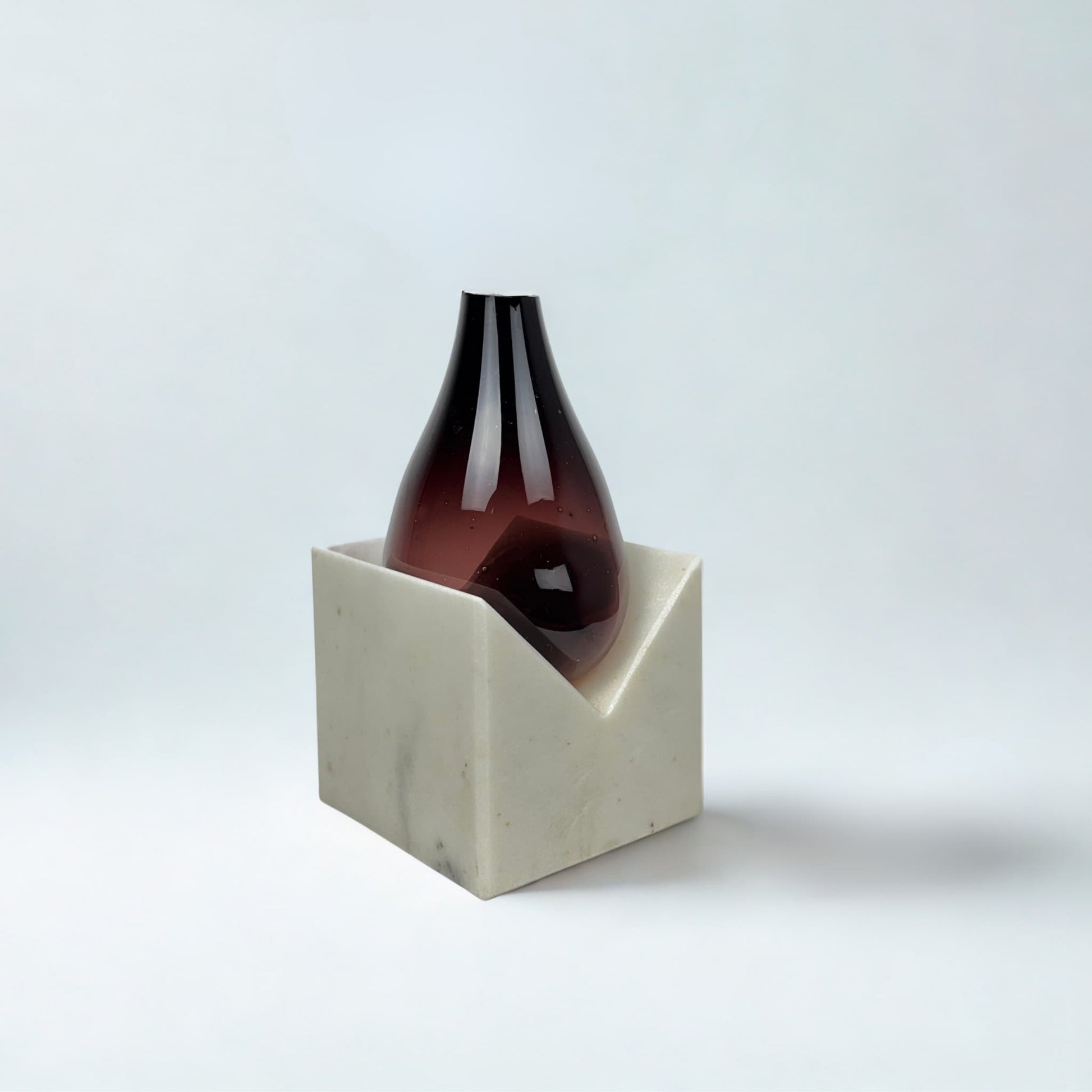 Vazonun tabanında yer alan, geometrik bir V formuna sahip masif beyaz mermer blok, sağlamlığı ve saflığı temsil eder. Bu mimari tabanın üzerinde ise, akışkan ve narin yapısıyla derin bir kontrast oluşturan üfleme cam vazo yükselir. Camın, bordo renkten şeffafa doğru açılan zarif geçişi, mekâna sıcak ve sofistike bir enerji katar. Işığın, camın kavisli yüzeylerinde kırılmasıyla ortaya çıkan bordo tonları, vazo tabanındaki mermerin serin duruşunu dengeler.