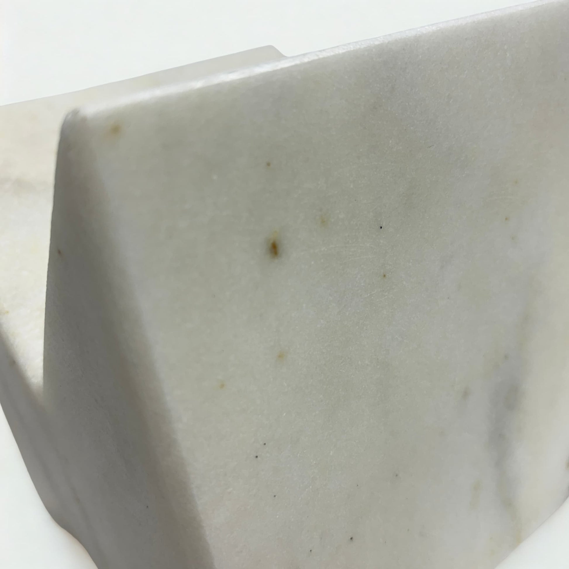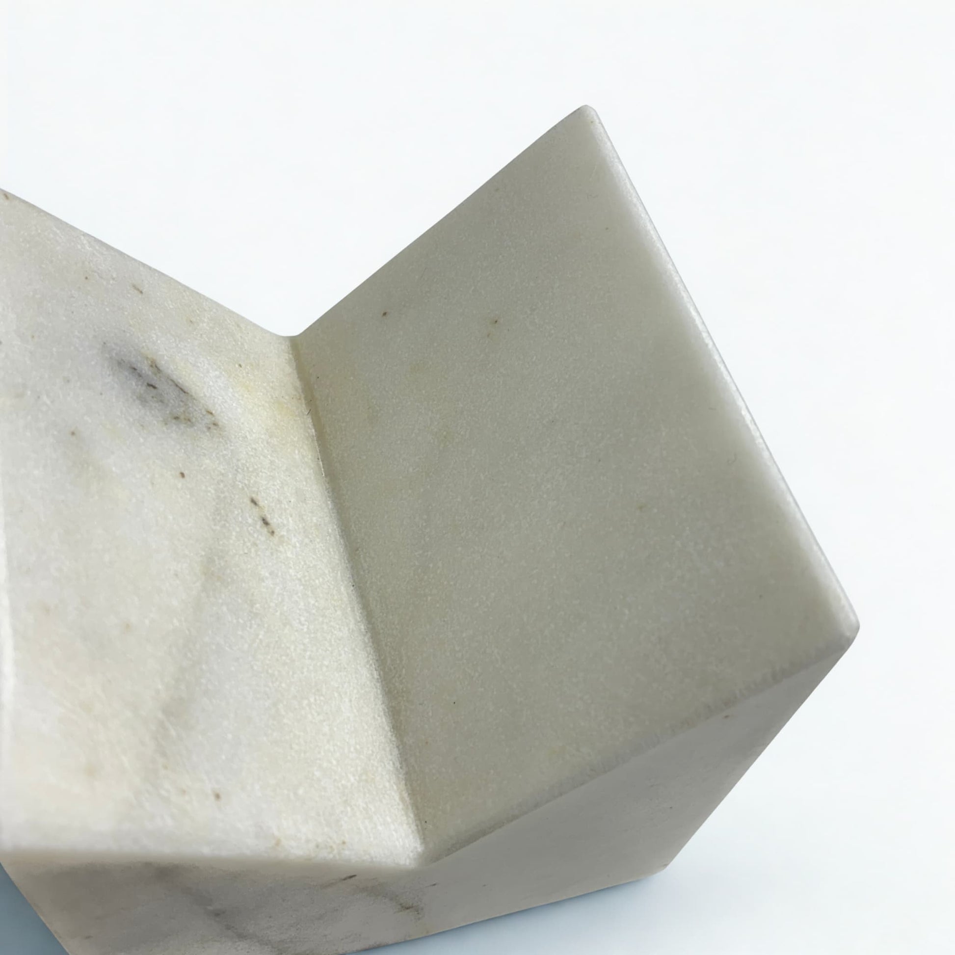 - Mermer Özelliği: Pürüzsüz yüzeyli, geometrik kesimli, beyaz/hafif gri damarlı masif mermer.