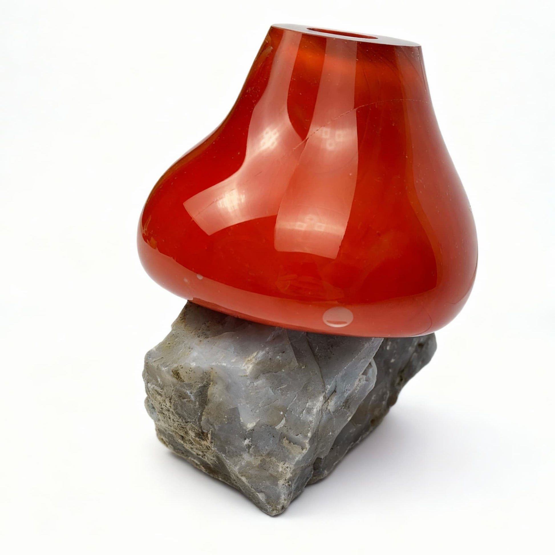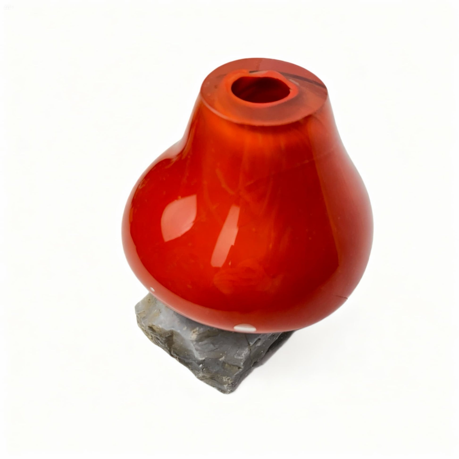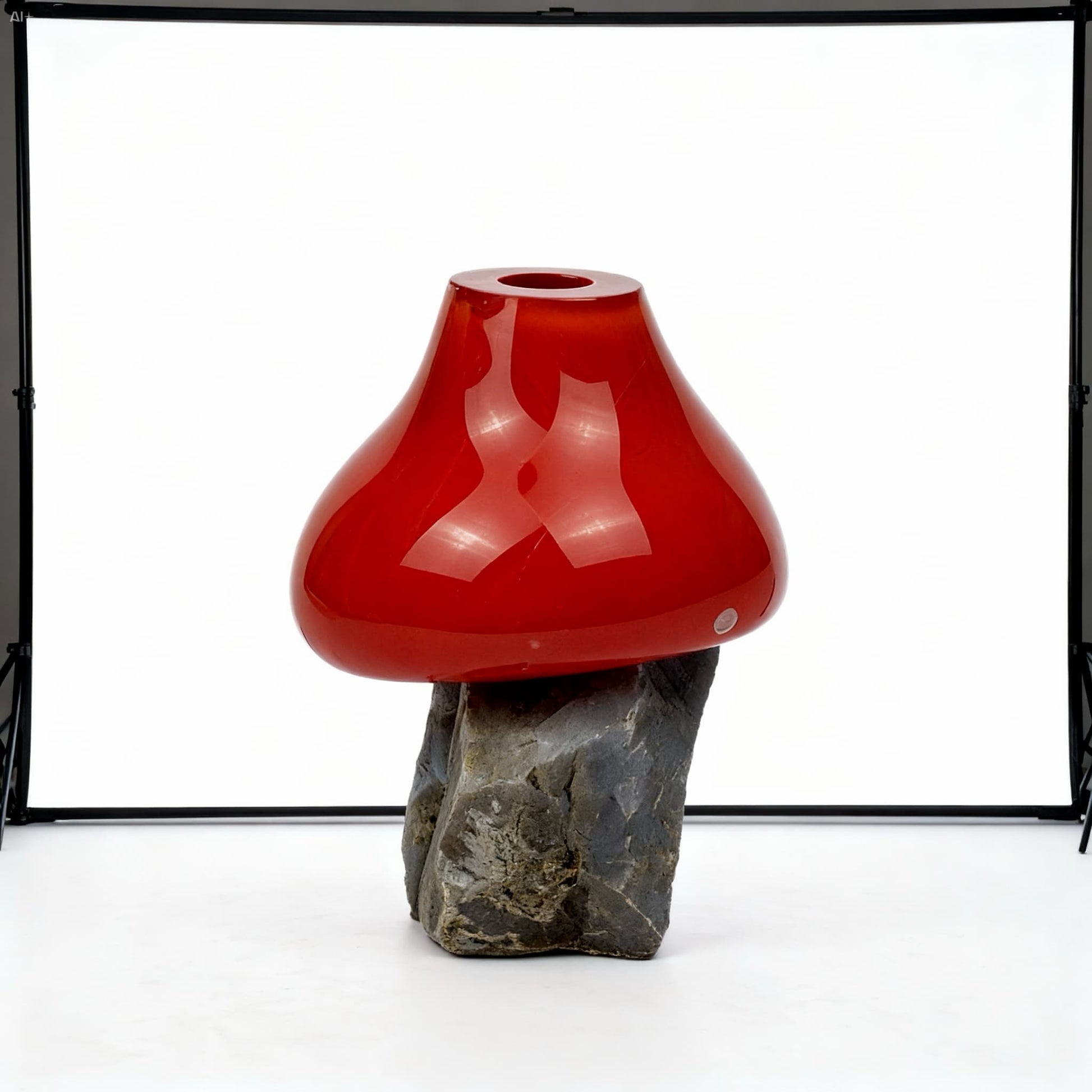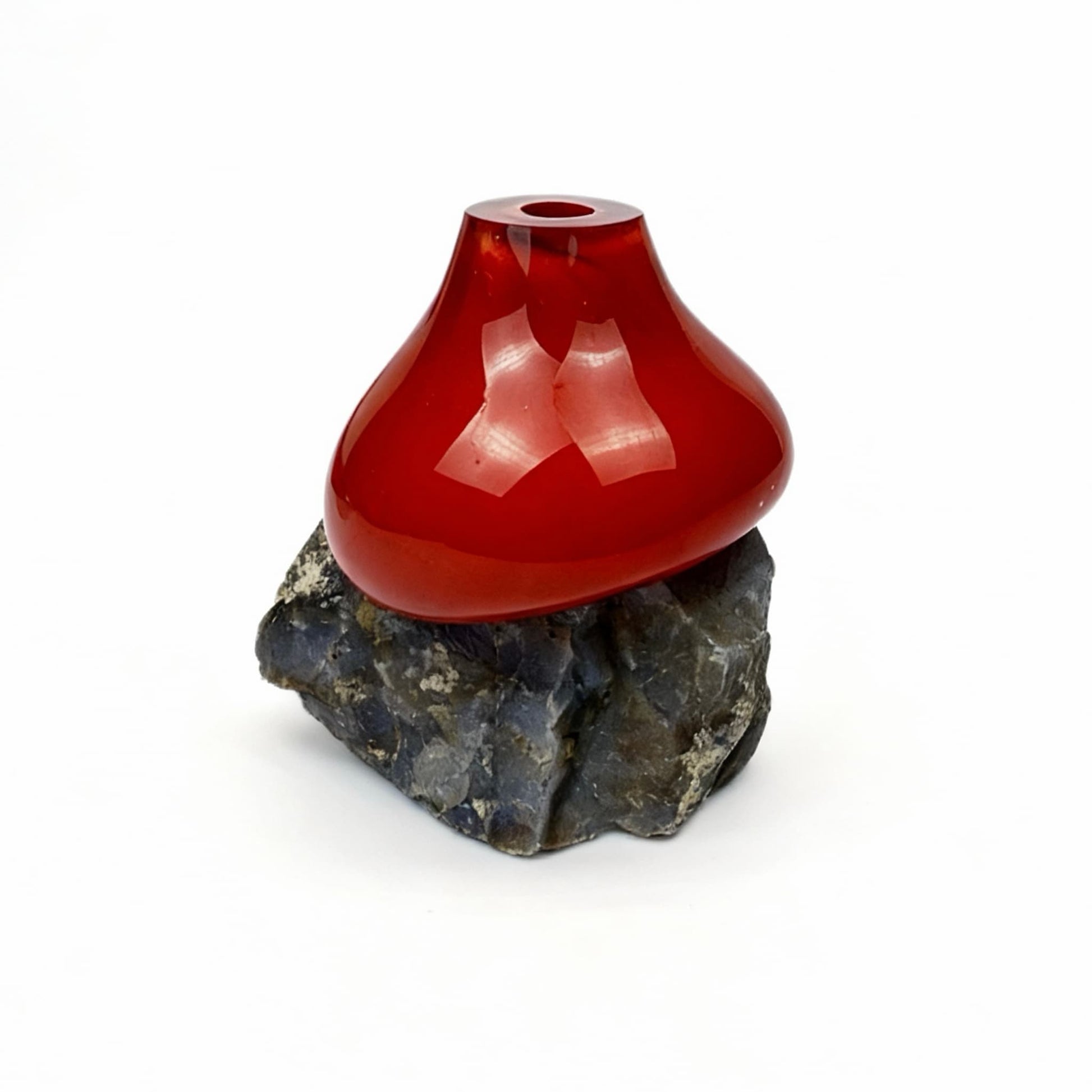 Cam form, taşın üzerinde konumlanarak yüzeyde belirgin bir odak oluşturur. Koyu turuncu ton, camın içinde yoğunlaşır; ışıkla birlikte farklı açılardan değişen bir görünüm sunar. Camın akışkan yapısı, taşın sabit formu üzerinde sakin bir duruş sergiler.