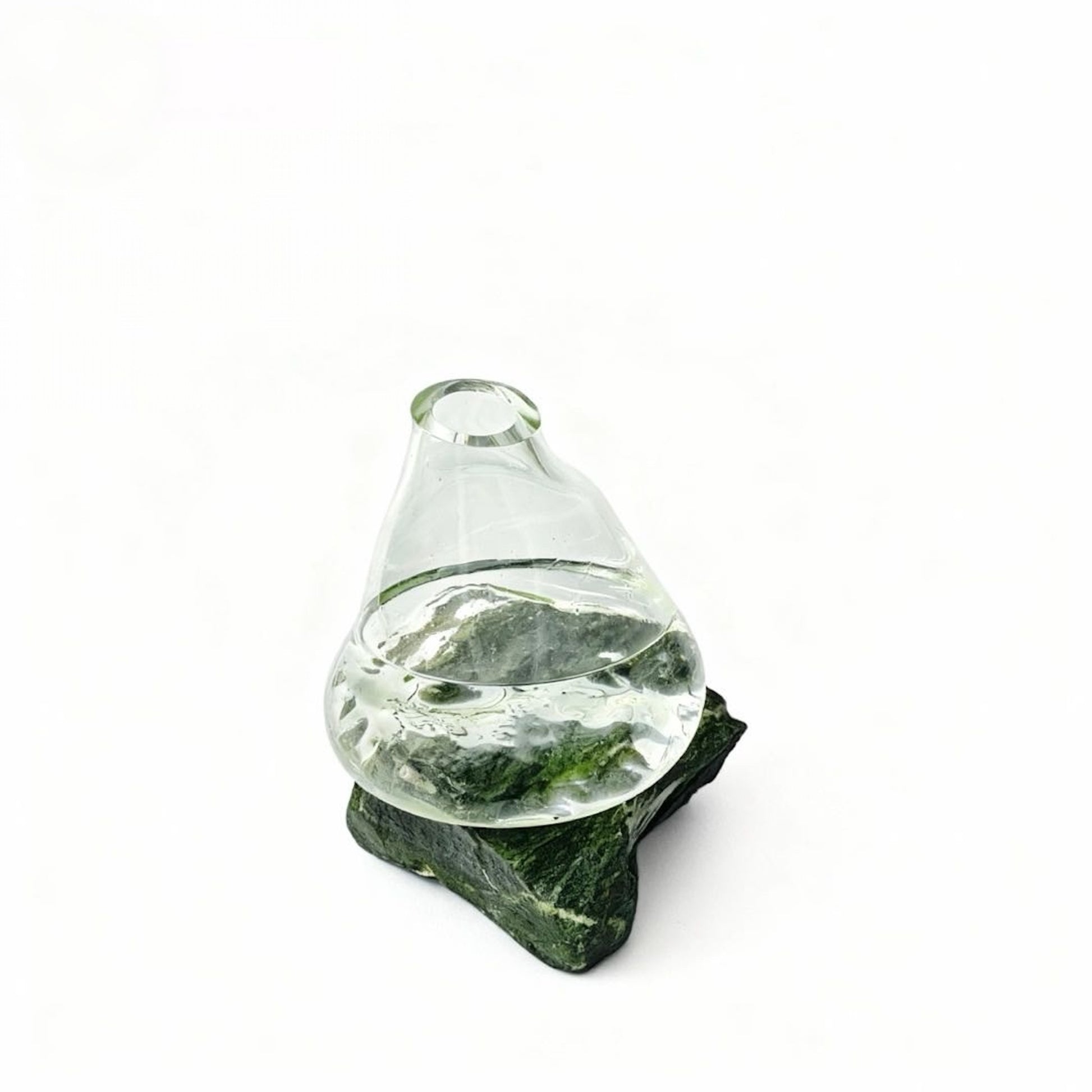 - Canlı Doku: Taşın üzerindeki yeşil hareler ve mineral katmanlar, şeffaf camın altından süzülerek mekana "botanik" bir enerji yayar.