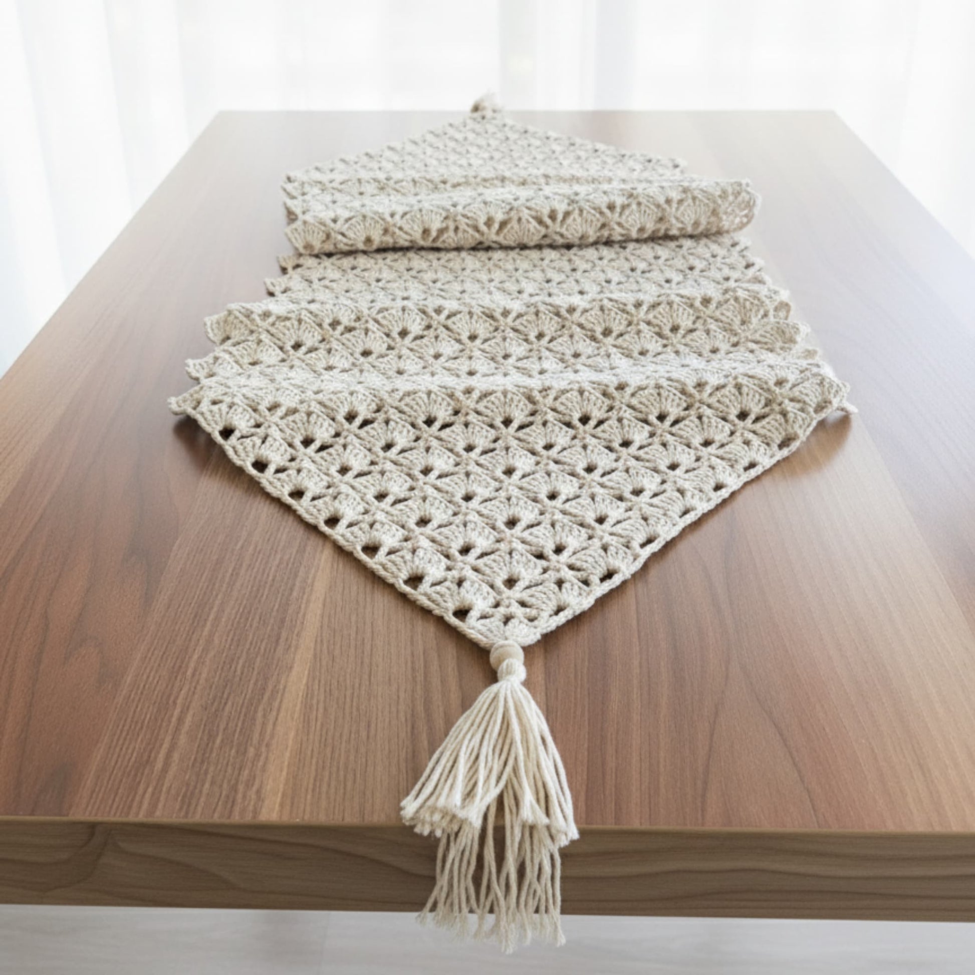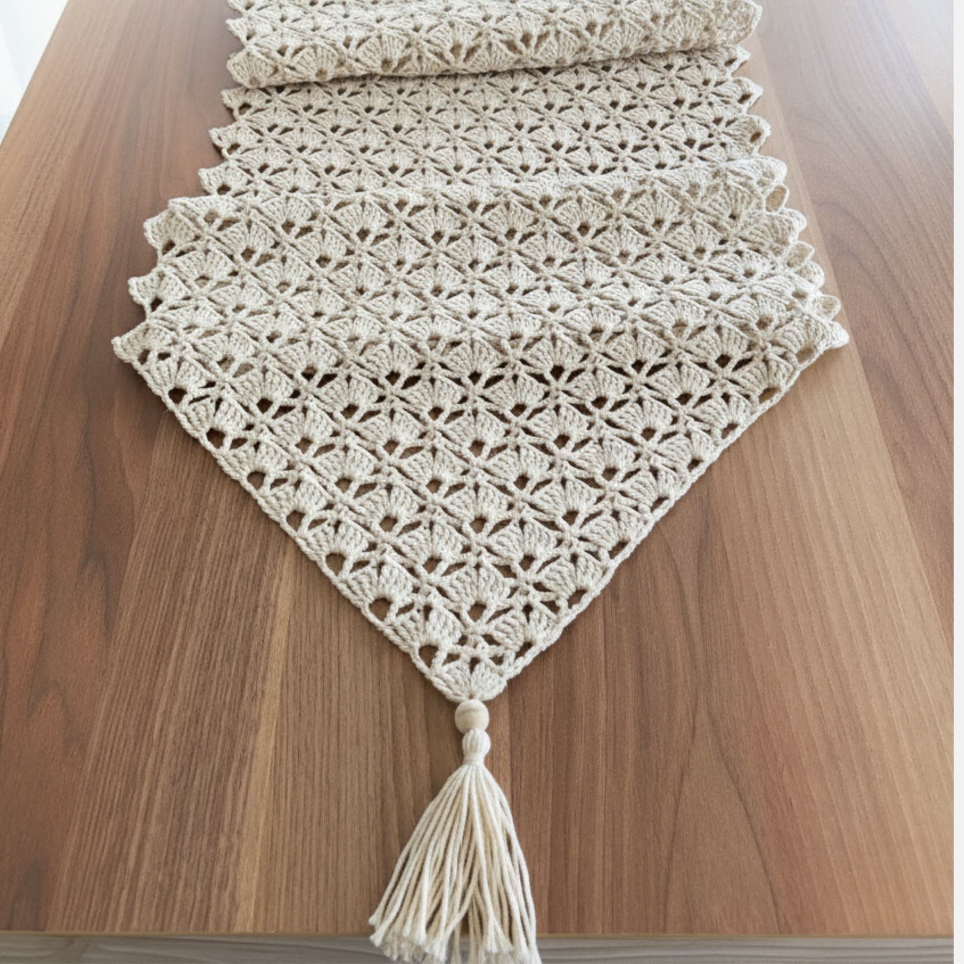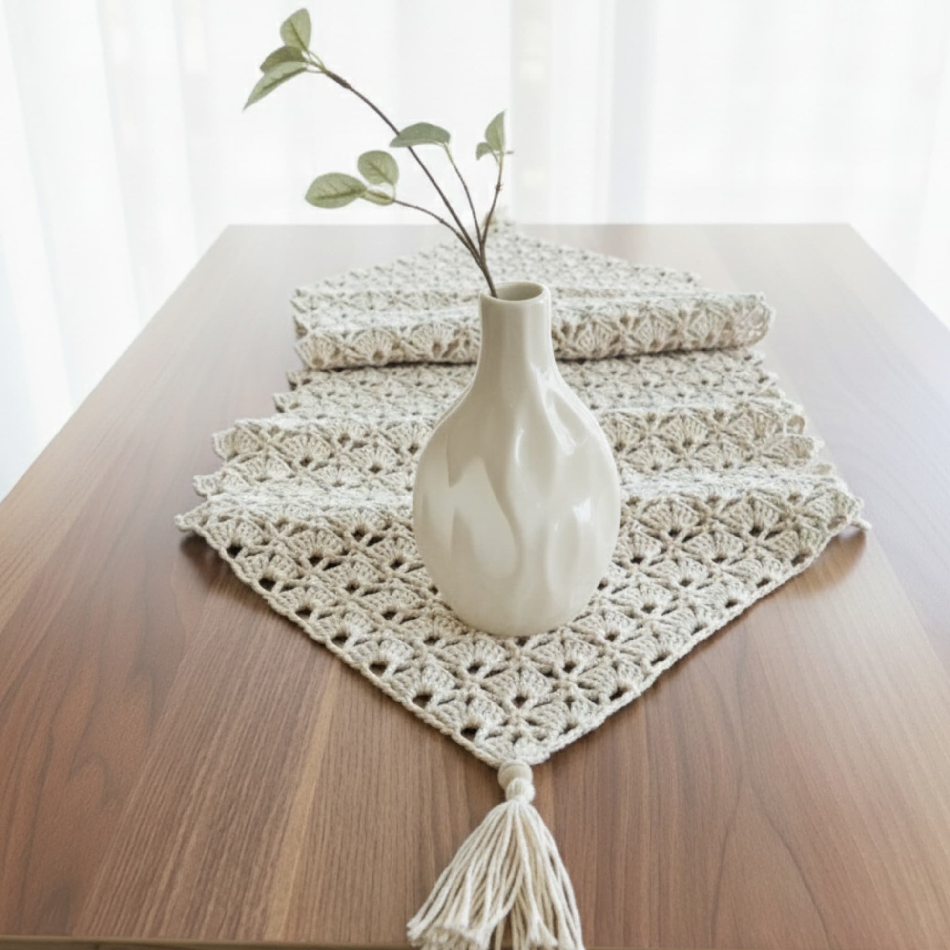 %100 el yapımı Lina Makrome Runner, doğal pamuk ip dokusu ve püskül detaylarıyla yaşam alanlarınıza zarif bir dokunuş kazandırır. Sade krem tonuyla modern ve boho dekorasyonlara mükemmel uyum sağlar.