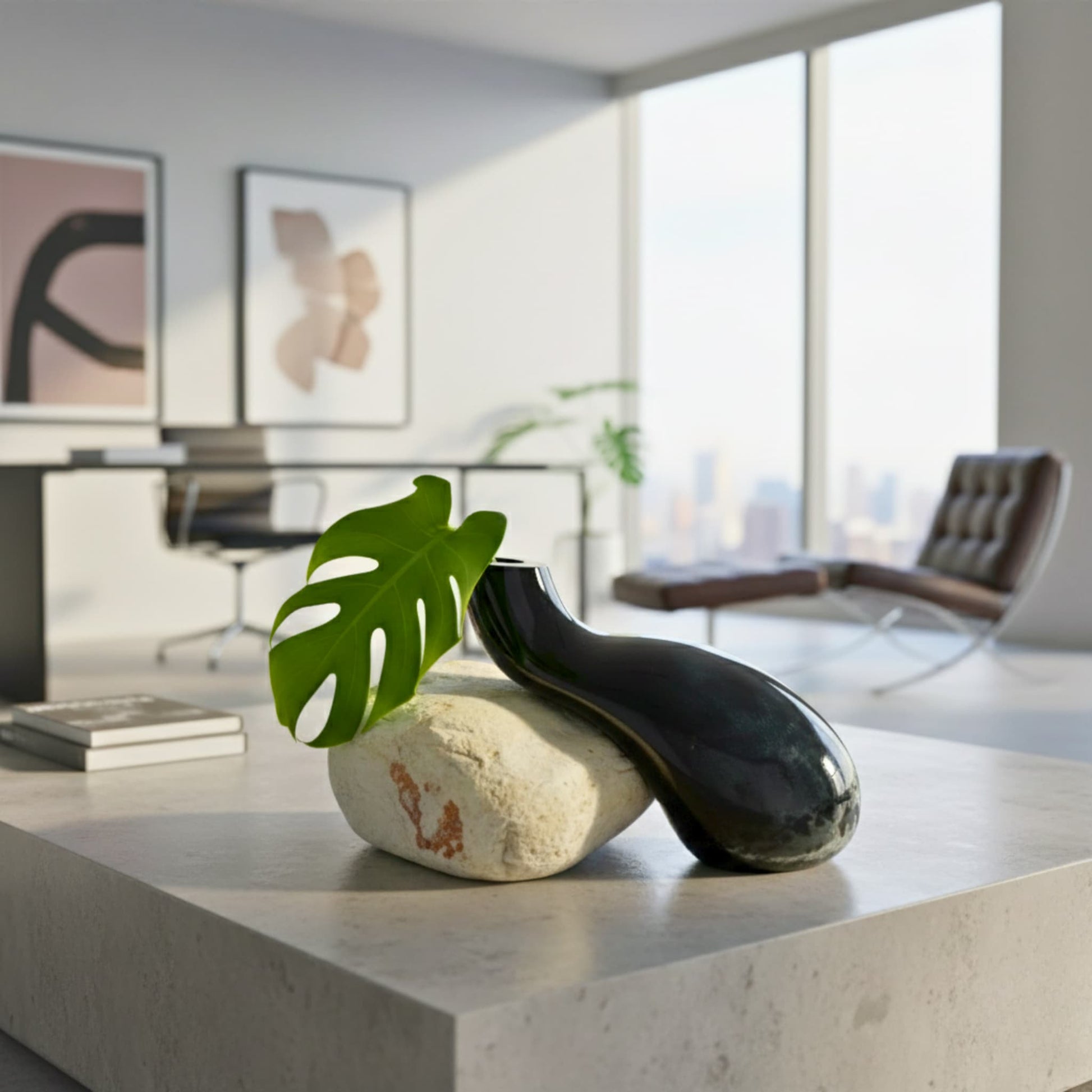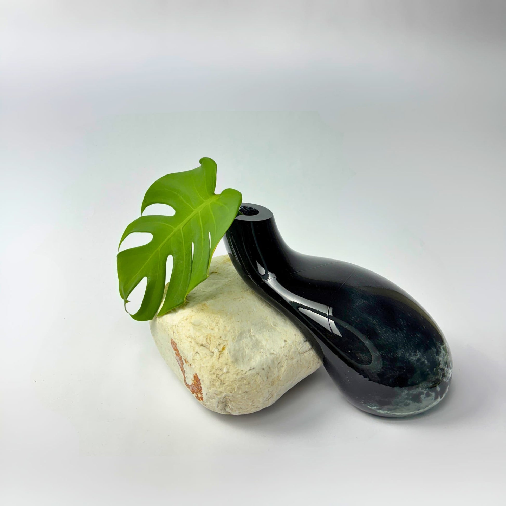 Güçlü ve karakter sahibi tasarımıyla Noir, içine yerleştirilen tek bir yaprağı bile bir sanat eserine dönüştürürken, boş olarak sergilendiğinde de heykelsi bir duruş sergiler. Modern ofislerden minimalist salonlara kadar her mekana ağırlığını koyan bu parça, doğanın zıtlıklardan doğan uyumunu yaşam alanınıza taşır. Her Noir, üzerine konduğu taşın ve üflenen camın doğası gereği eşsizdir — tıpkı her gecenin kendine has bir hikayesi olması gibi.