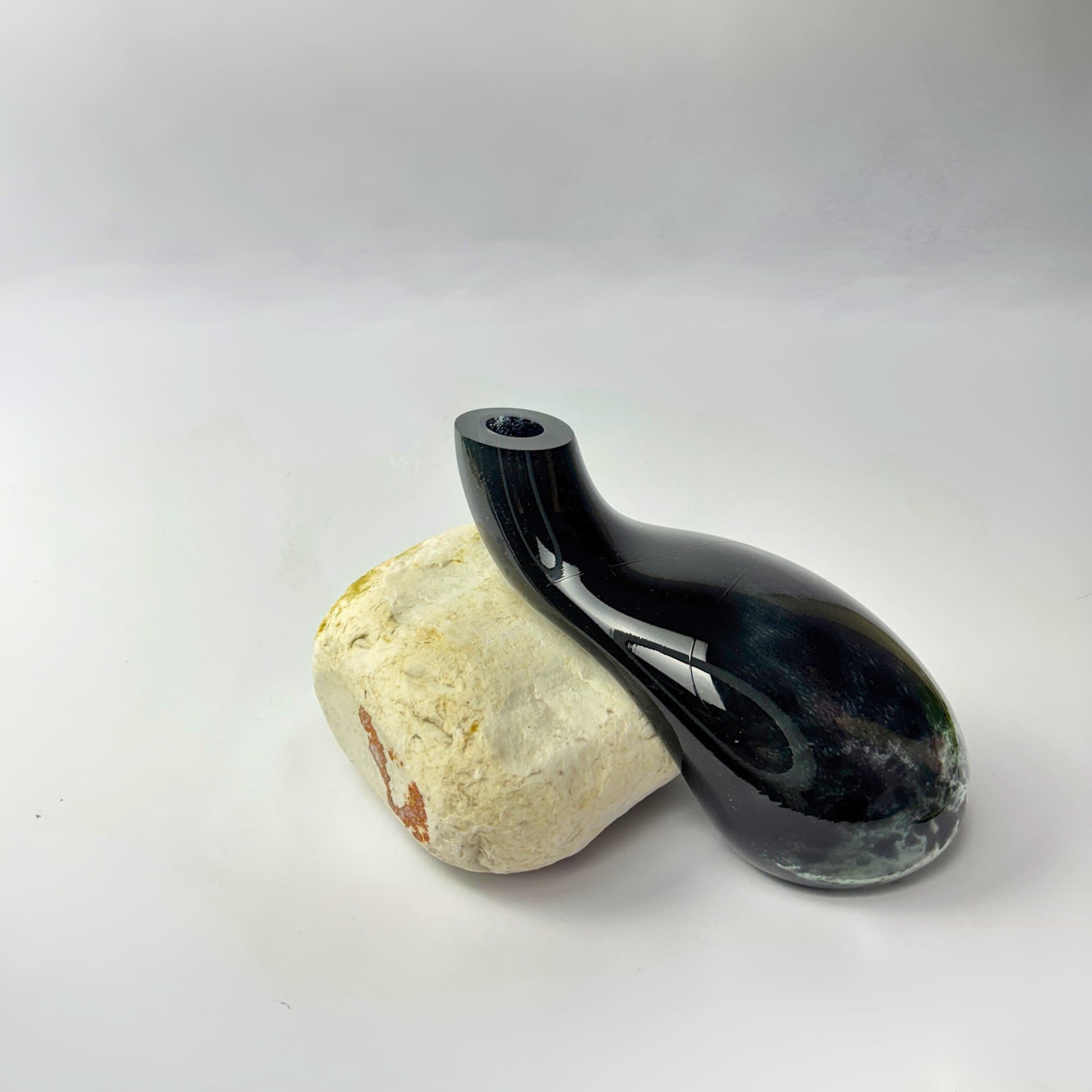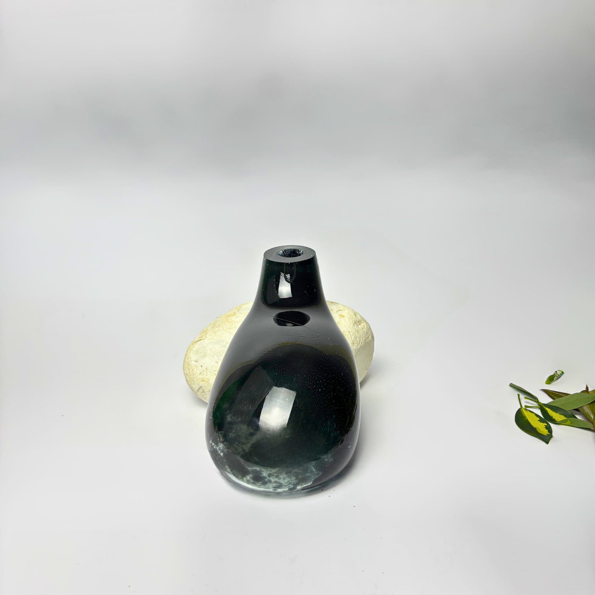 Her biri usta ellerde şekillenen Noir Siyah Cam Vazo, gecenin akışkan karanlığını simgeleyen formuyla, doğal taşın ham ve gerçekçi dokusunu bir araya getirir. El üflemeli camın pürüzsüz ve parlak yüzeyi, altındaki doğal kaya parçasının gözenekli ve mat yapısıyla birleşerek dramatik bir kontrast yaratır. Bu zıtlık; ışıkla gölgenin, akışkanlıkla durgunluğun kusursuz dansını simgeler.
