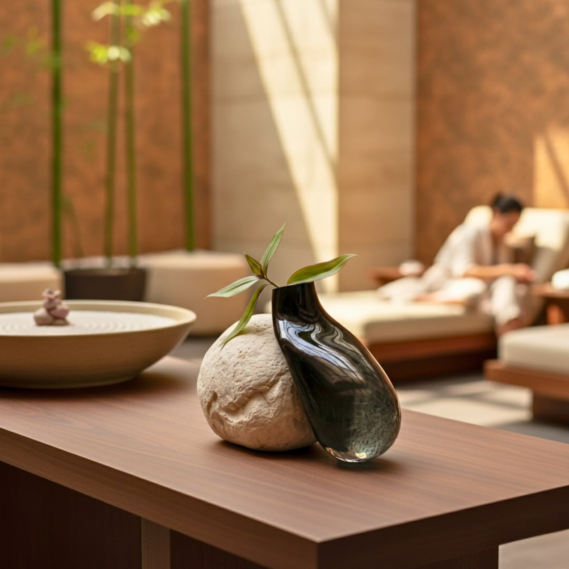 Bu özel parça, "zıtlıkların uyumu" felsefesinden beslenir. Ateşle şekillenen camın kusursuz pürüzsüzlüğü, yüzyıllara meydan okuyan doğal taşın mat ve girintili yüzeyine nazikçe yerleşir. Sanki erimiş bir madde, taşın üzerinden süzülürken zaman durmuş ve bu estetik form ortaya çıkmıştır. No:1'den farklı olarak bu tasarımda, camın taş üzerindeki "sarılma" etkisi ve yerçekimine meydan okuyan akışı daha ön plandadır.