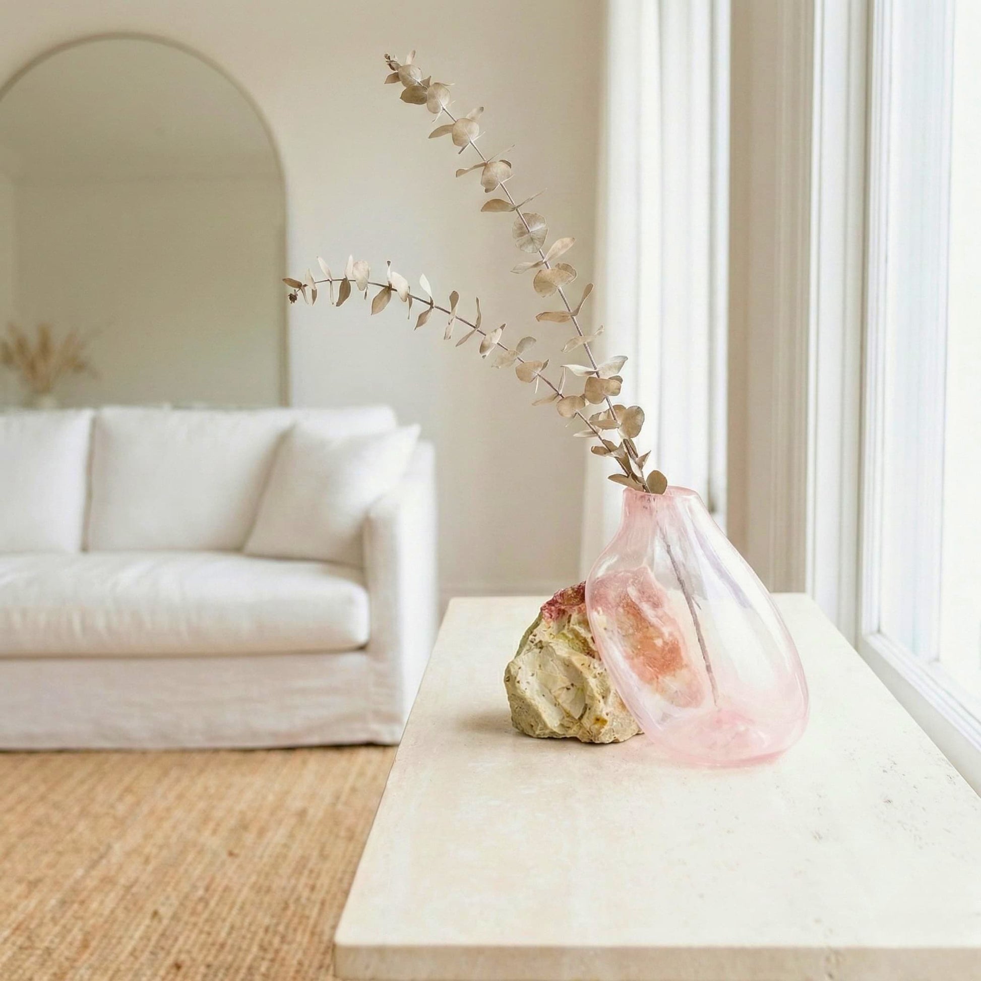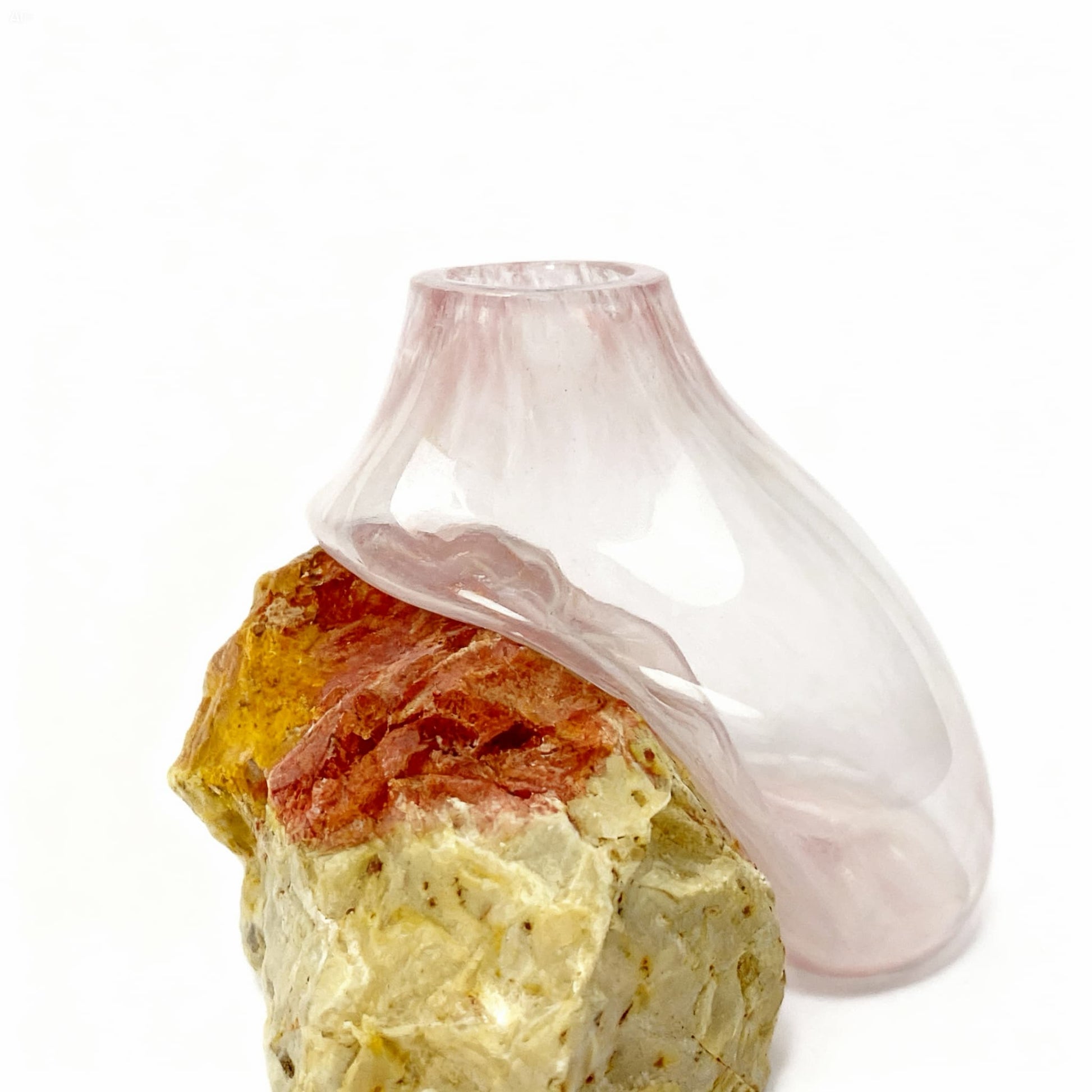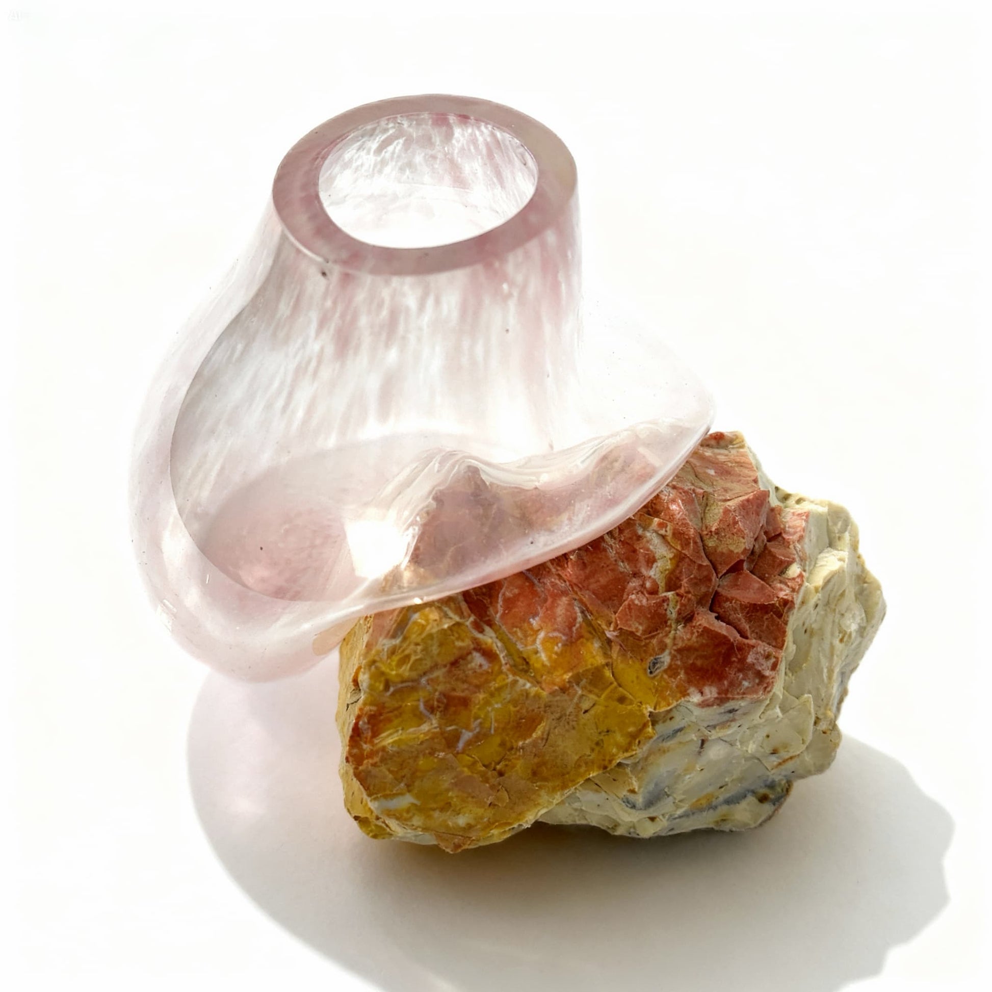 Kızgın ve akışkan haldeki cam, doğal bir kaya parçasının üzerine serbest bırakıldığında, yerçekimi ve ısının etkisiyle taşın en doğal formunu alır. Camın yumuşak pudra pembe tonu, altındaki doğal taşın güçlü, dünyevi dokusuyla birleşerek yaşam alanınıza hem dinginlik hem de karakter katar.