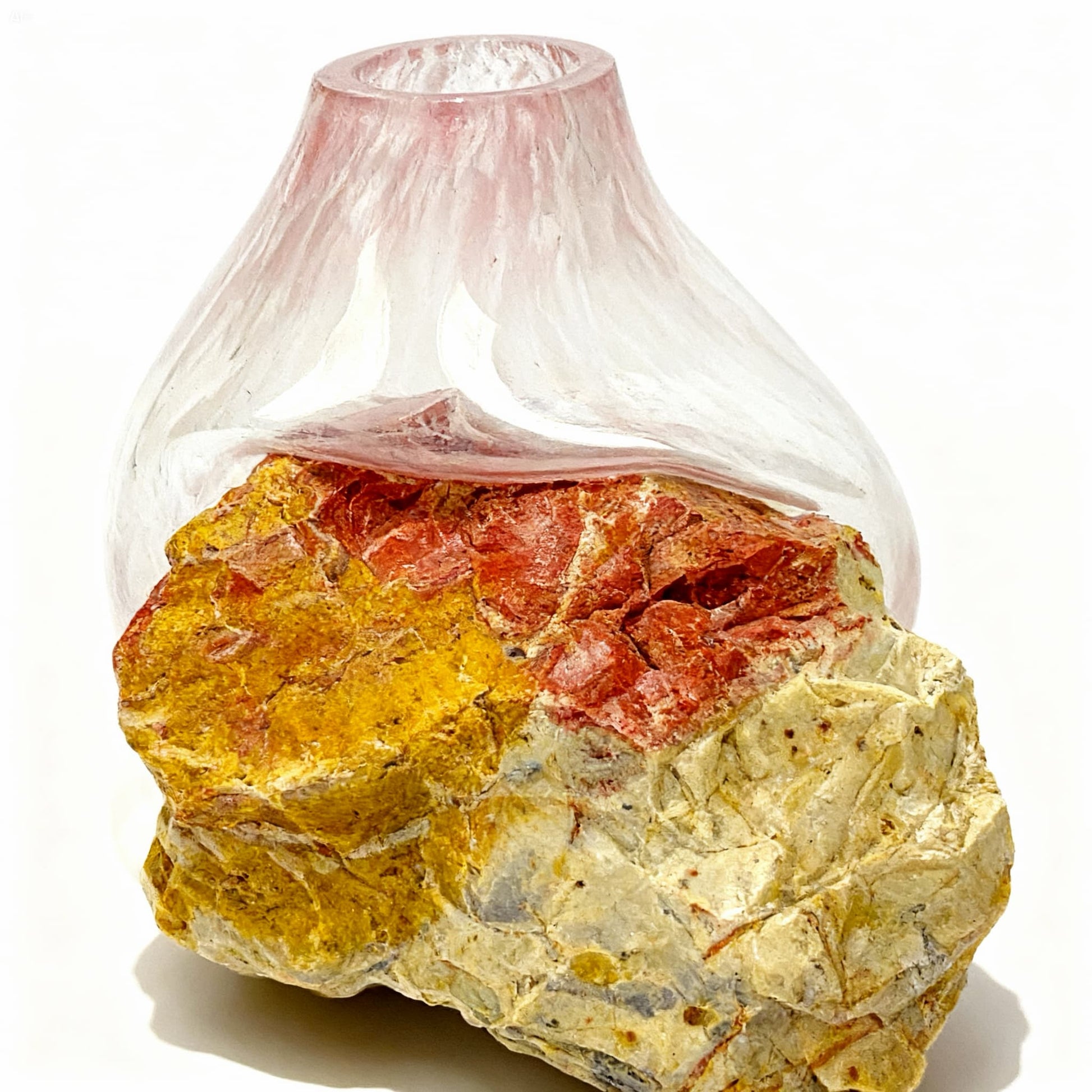 Terra Rose, doğadaki zıtlıkların yarattığı kusursuz uyumu temsil eder. Bu özel parça, sadece bir vazo değil; akışkan camın sert kayayla buluştuğu o "donmuş an"ın heykelsi bir tasviridir.
